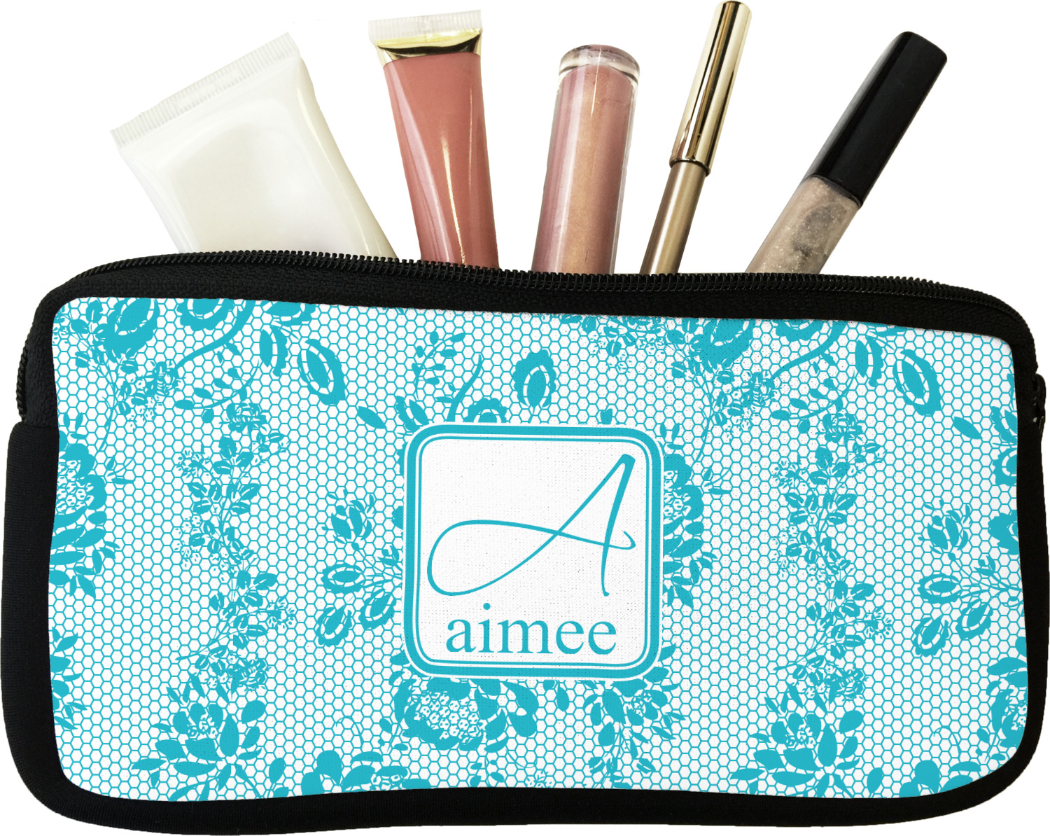 Our personalized makeup bags are available in many different designs, patterns and colors - so you are sure to find one that will love. They are made of neoprene (same material as wet-suits) and thus are water resistant, so spillages in your makeup bag will not end up all over you purse. They are customized on one side and are black on the other side and the zipper is black as well.