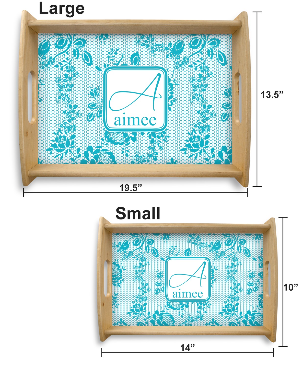 This serving tray with handles features square edges and two rounded sides, creating a very modern look. Each side is fabricated from a beautifully cut, natural wood. The bottom of the interior of the tray displays your customized design in bright, vibrant color. The tray is sold in both a black color and a natural wood look. Each variation of the wood serving tray has two sizes: Small, which is 14" x 10" x 2.25", and Large, which is 19.5" x 13.5" x 2.75".