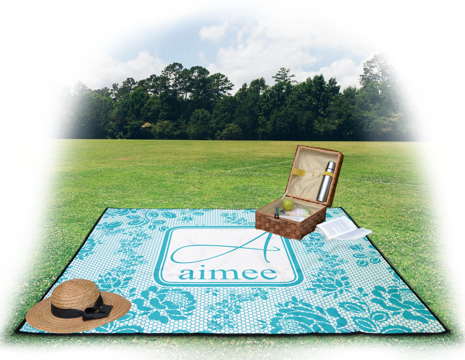 This picnic blanket is perfect for hanging out with your friends at the park or anywhere outside. The top of the blanket is made of a super soft microfiber fleece. The bottom of the blanket is made of a black material similar to a rain jacket and is water repellent as well. This will keep any wet spots on the ground from soaking through your picnic blanket. No one likes a wet blanket. The blanket measures at approximately 50" x 59" and has a nicely finished ribbon edge.