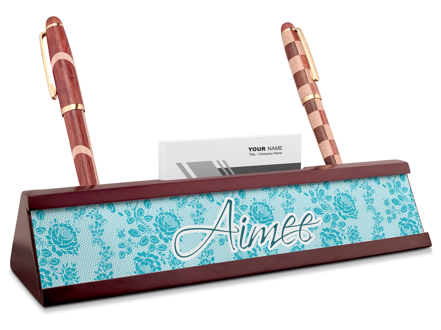 Your desk name plates are crafted from a high-quality, dark-cherry mahogany. At approximately 9.5 by 1.875 by 2.5 inches, this name plaque will fit perfectly, front and center, on your desk. Your customization spans across the entire face of the nameplate. Behind the nameplate lies a skinny slot that can fit approximately 15, traditionally-sized, business cards. You can also store your writing utensils on either side of this custom desk name plate.