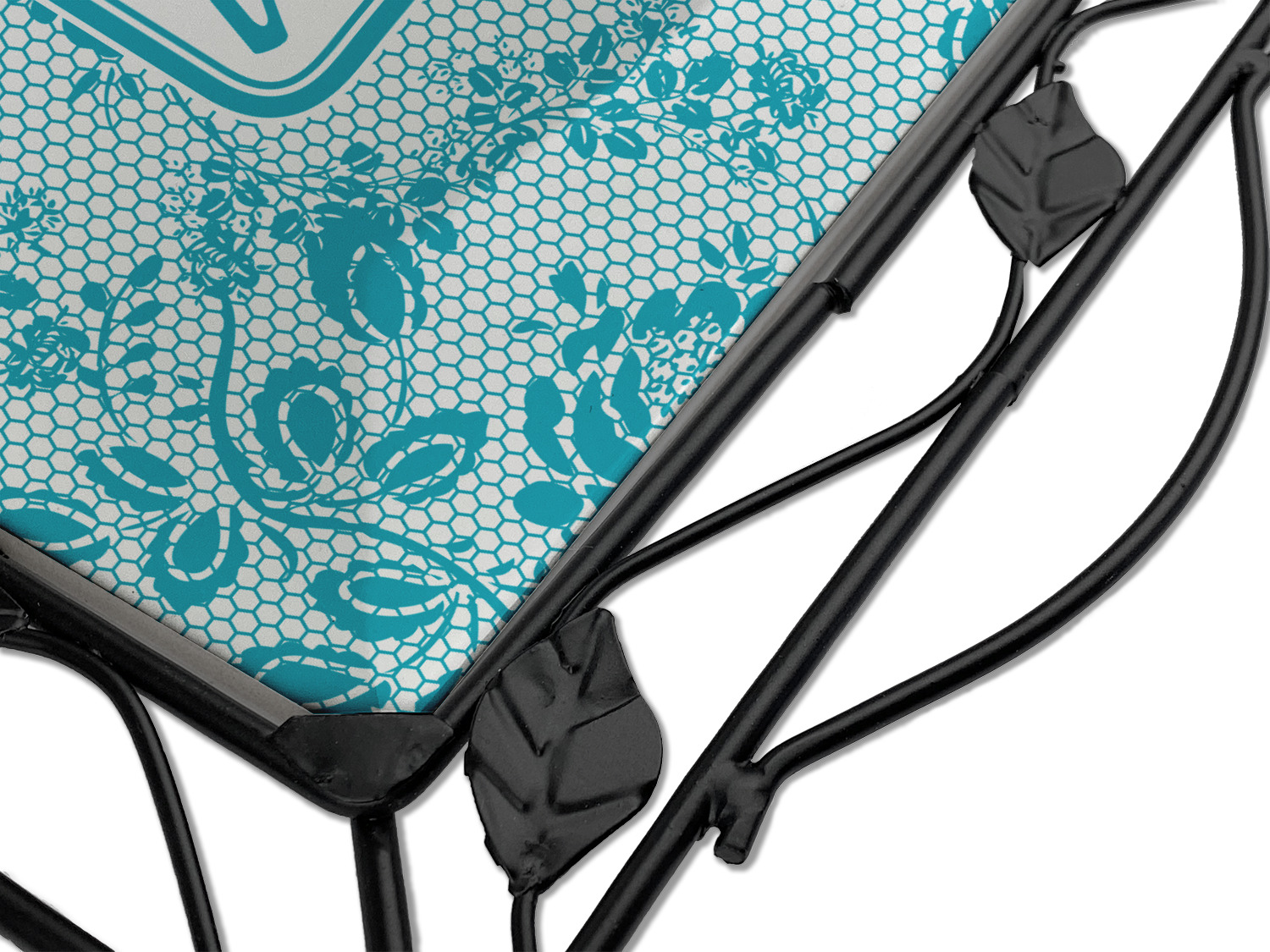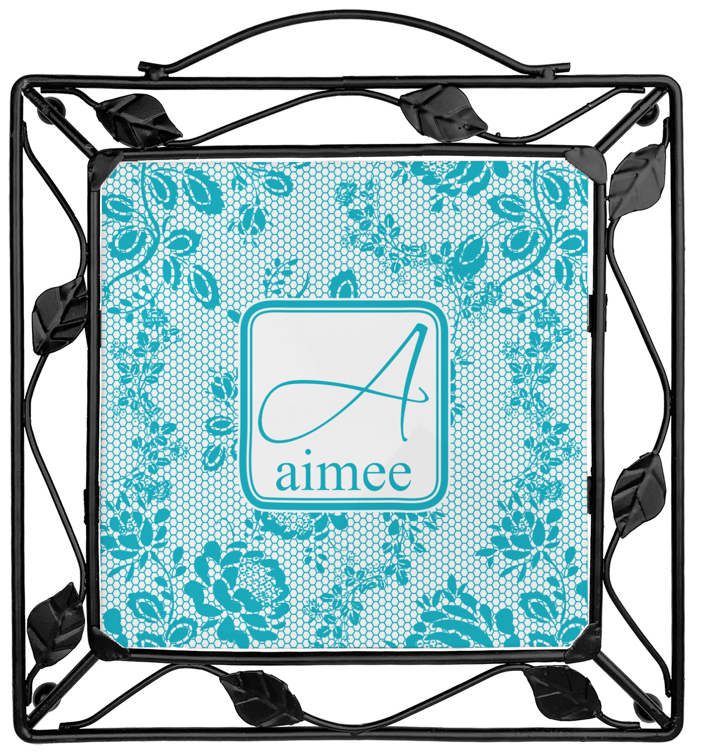 Our square trivets are made from a durable, wrought iron. This model features 4 small half circles, one on each corner, and a larger ring of iron that circles the central, customized tile. Each of the 4 corners has a round foot on its bottom for stability. This trivet is 8.75 by 8.75 inches, but the central tile measures at 6 inches on both sides.