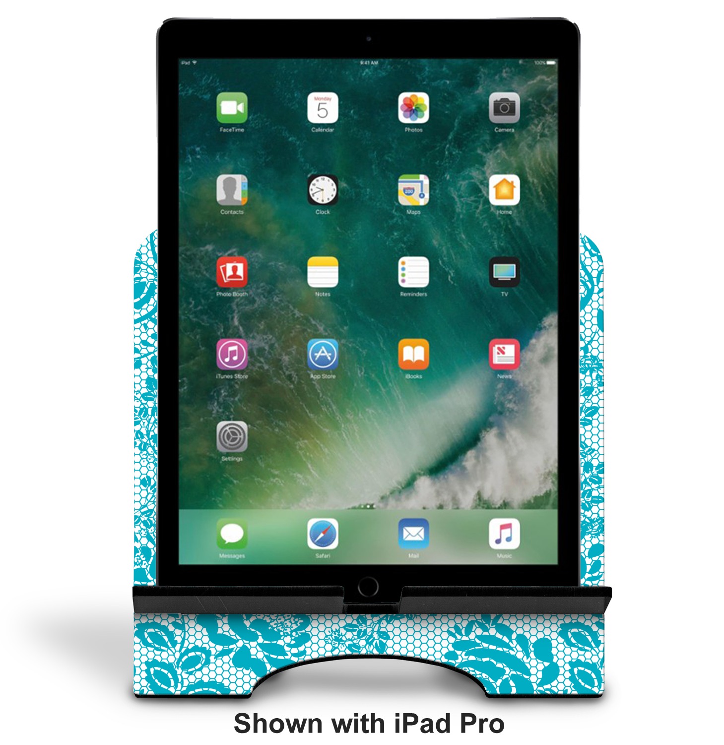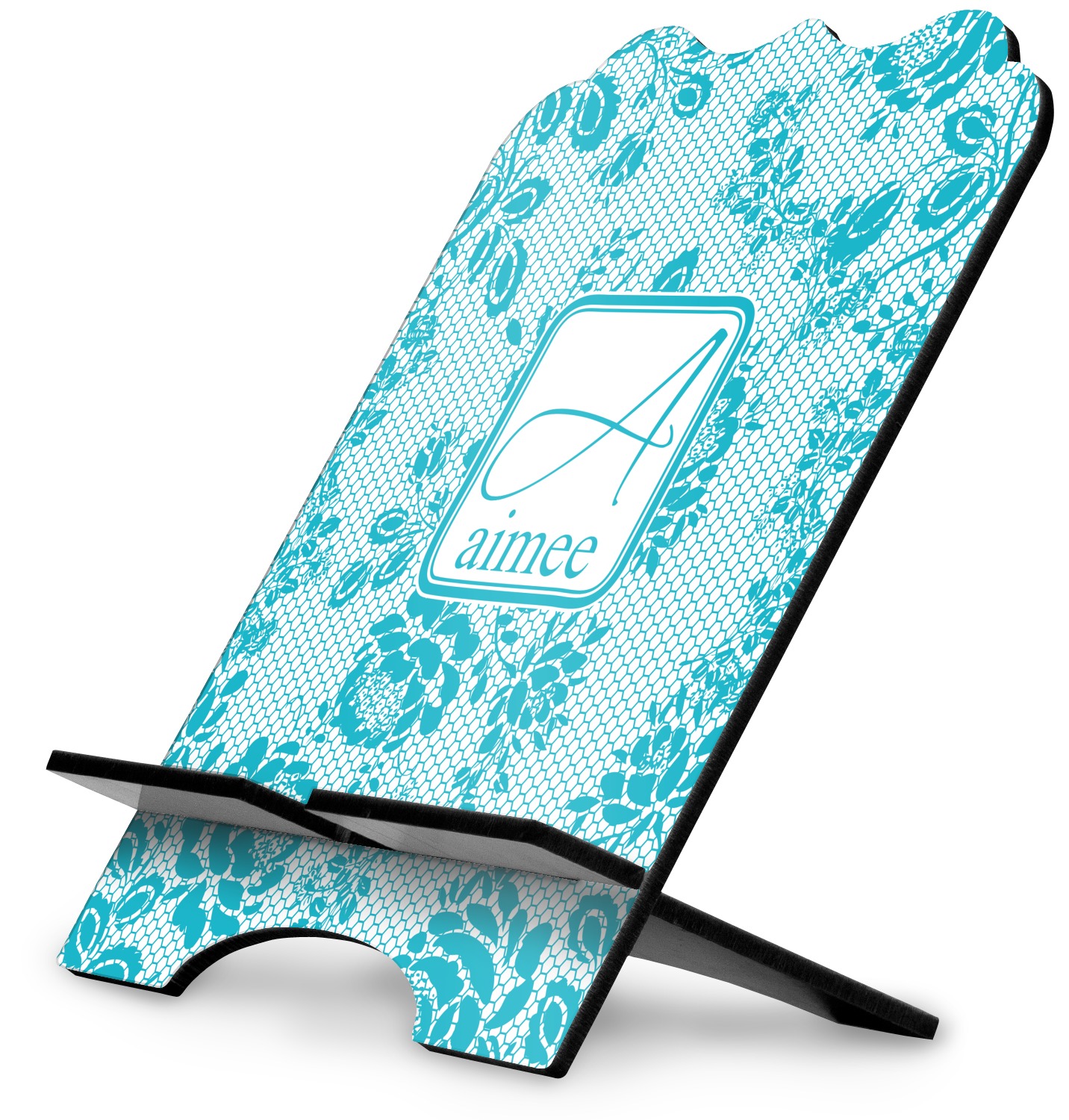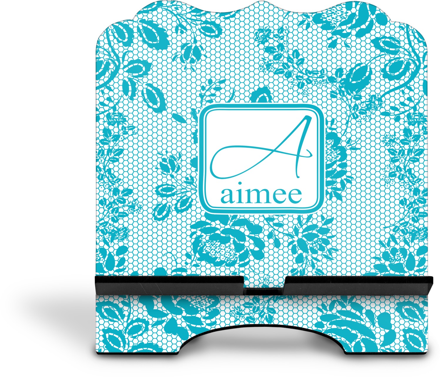 The stand is comprised of two hardboard pieces that fit snugly together and stabilize one another. The bottom part of the iPad stand supports your tablet, and has space for your tablets charger while in use. At 9.25" x 11.5", this tablet mount can support a device between the sizes of the iPad Pro and the iPad Mini 2. The uppermost part of the stand features a decorative, curved edge for a classy, suave appearance. We print your customization atop the face of the stand, in vibrant color. The remaining sides are colored a sleek black.