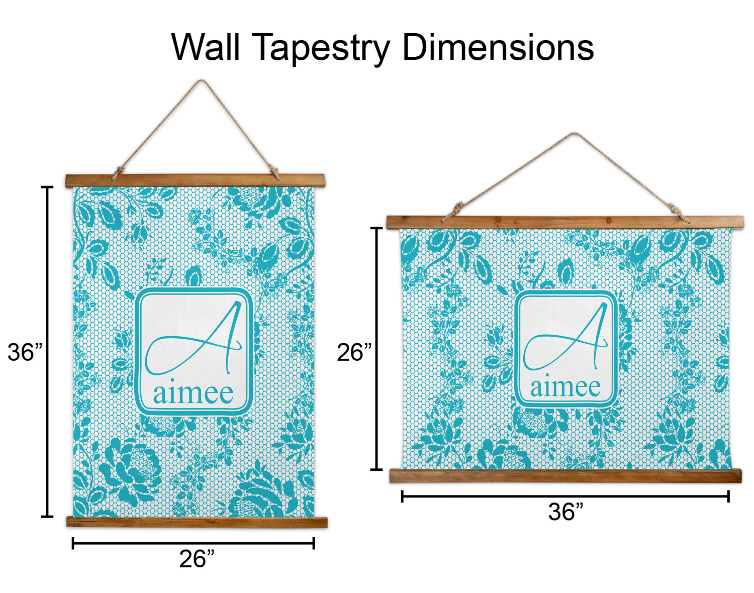 Made in two different orientations - portrait or landscape - both are 26" x 36". Your design is printed on a high quality polyester fabric with hemmed edges. The wood on the top and bottom of the tapestry is 1.25" tall and 0.25" thick and there are two pieces on top and bottom which sandwich the fabric.