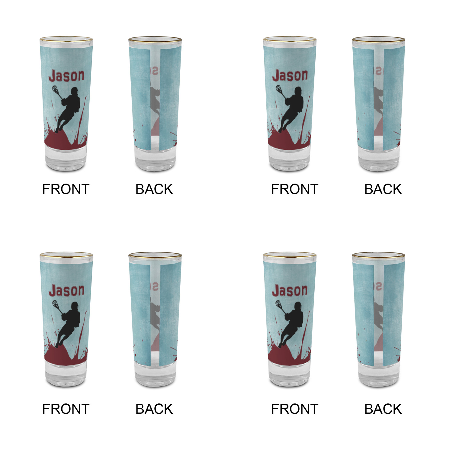 These glass shooter glasses are printed in full color with the design of your choice. These are a tall shooter 2 oz size and stand 4" tall. The print is a full wrap design to boldly display your personalization.