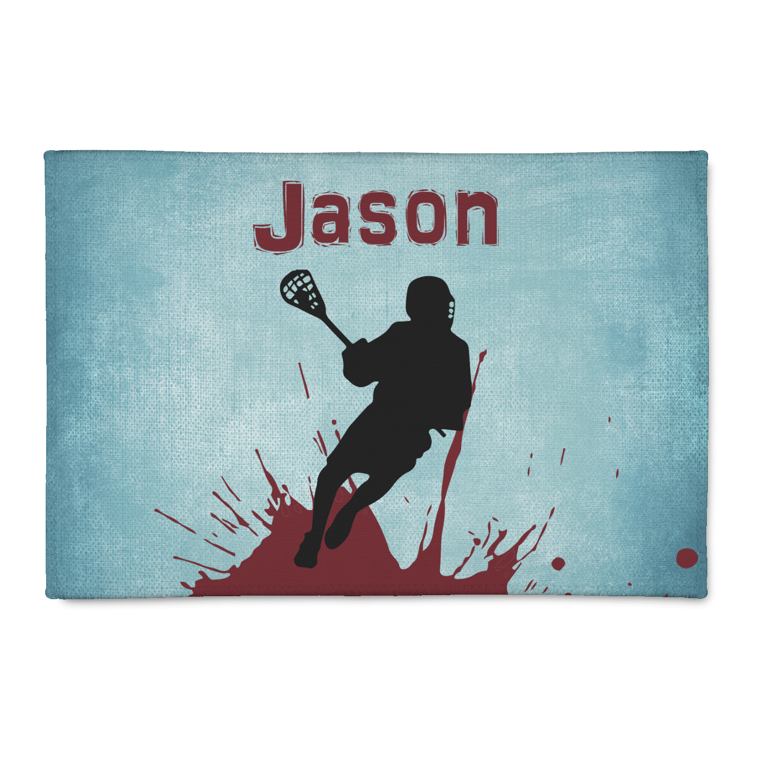 This design has a cool blue background with a literal splash of maroon. Your personalization goes above the lacrosse player silhouette. The movement in this design gives the perfect feeling for a sports design.