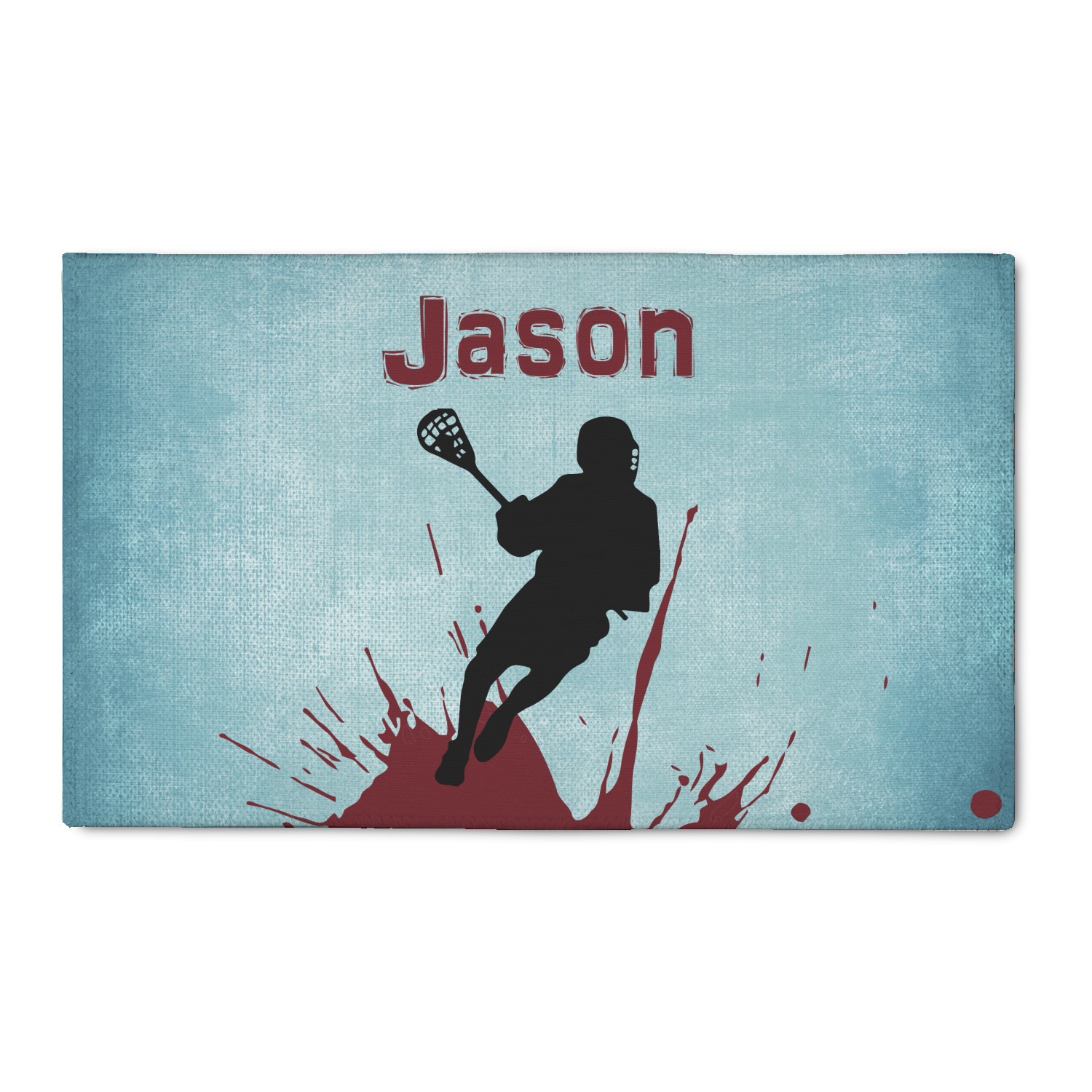 This design has a cool blue background with a literal splash of maroon. Your personalization goes above the lacrosse player silhouette. The movement in this design gives the perfect feeling for a sports design.