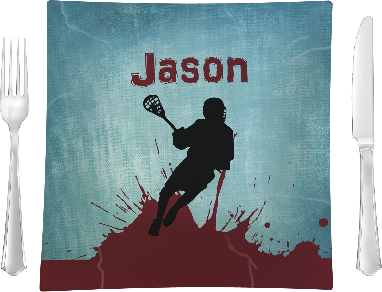This design has a cool blue background with a literal splash of maroon. Your personalization goes above the lacrosse player silhouette. The movement in this design gives the perfect feeling for a sports design.