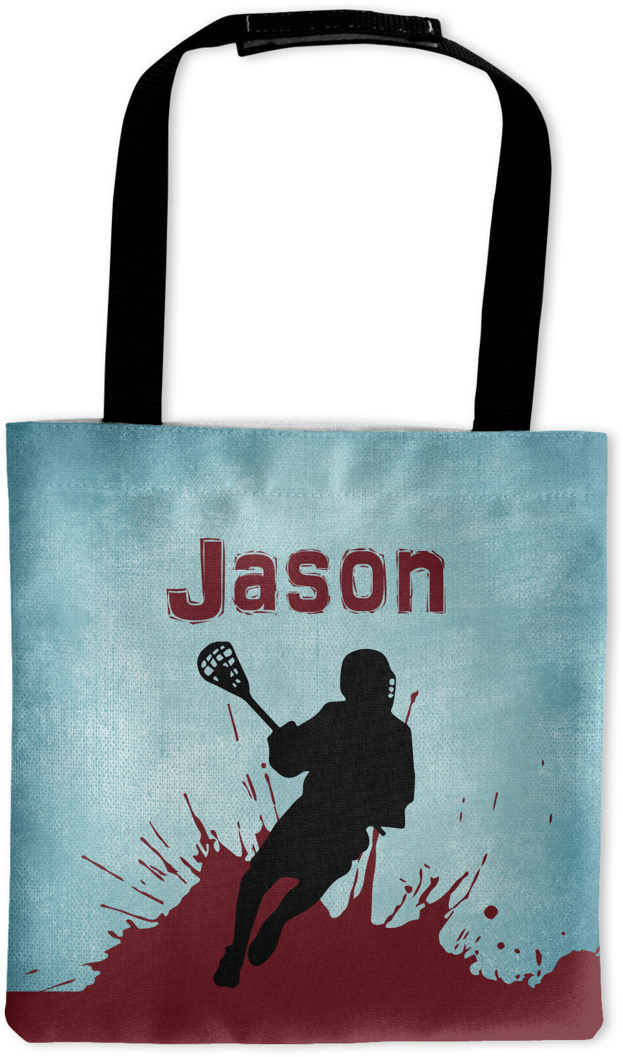 This design has a cool blue background with a literal splash of maroon. Your personalization goes above the lacrosse player silhouette. The movement in this design gives the perfect feeling for a sports design.