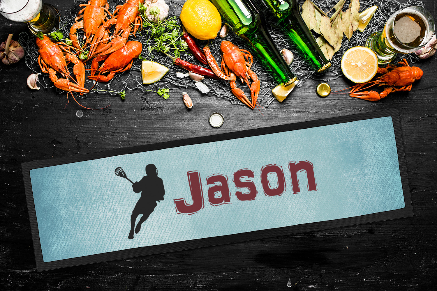 This design has a cool blue background with a literal splash of maroon. Your personalization goes above the lacrosse player silhouette. The movement in this design gives the perfect feeling for a sports design.