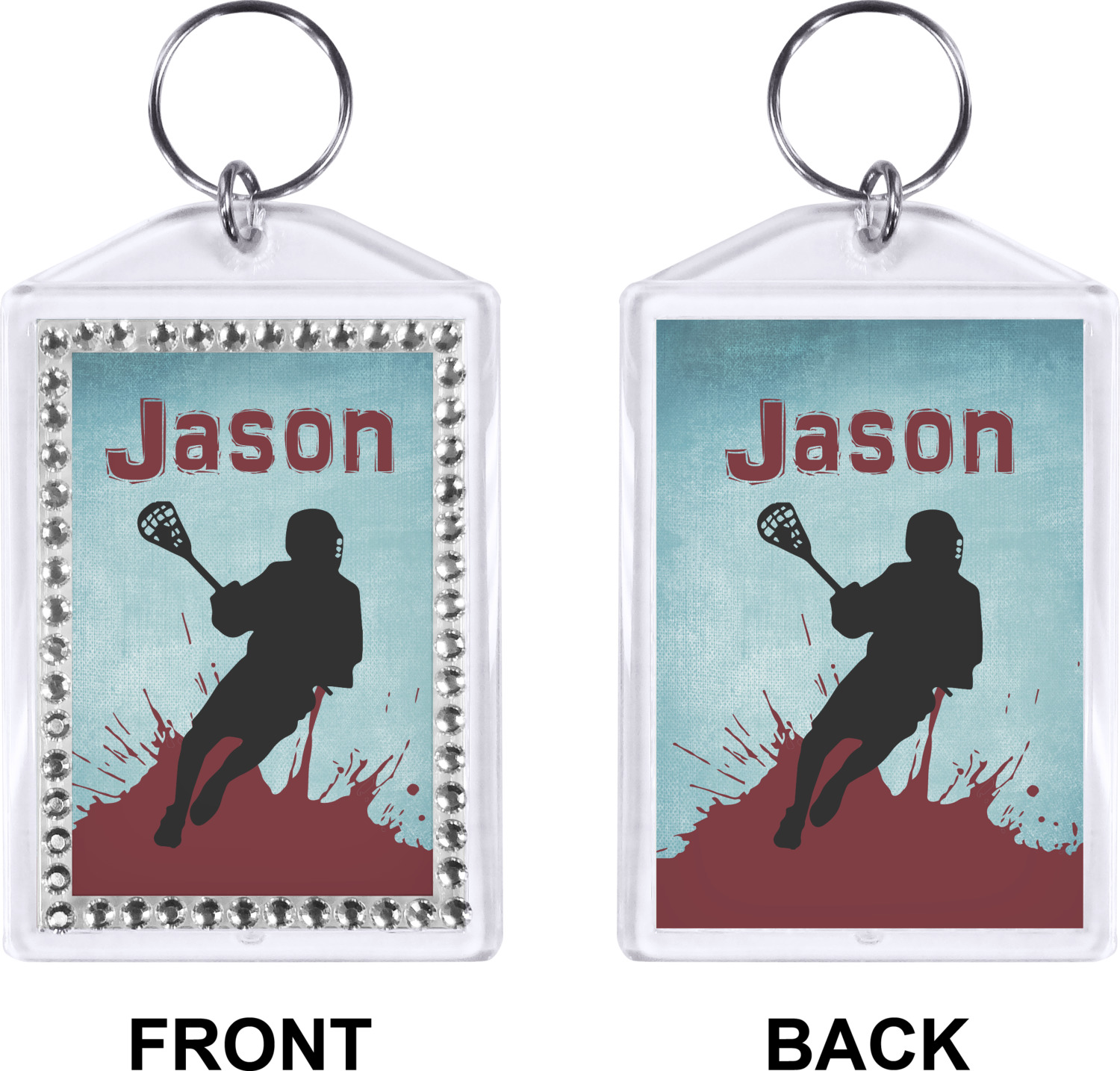 Our personalized keychains have a bold, rectangular shape, outlined by a series of shimmering rhinestones. A metal, split keyring is included with your purchase, and an additional metal hoop allows for attachment of the keychain to the split ring. This unique keychain measures at about 3.75 by 2.5 inches. We print your customized design(s) across both the back and front of this keychain.