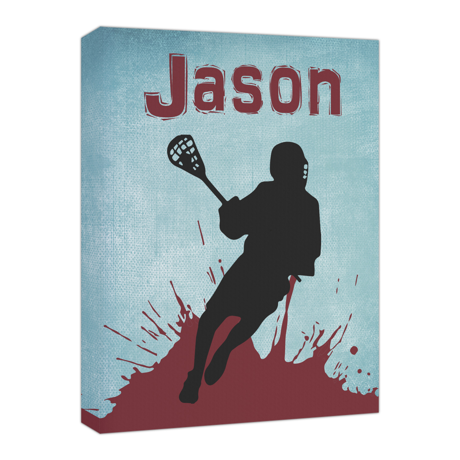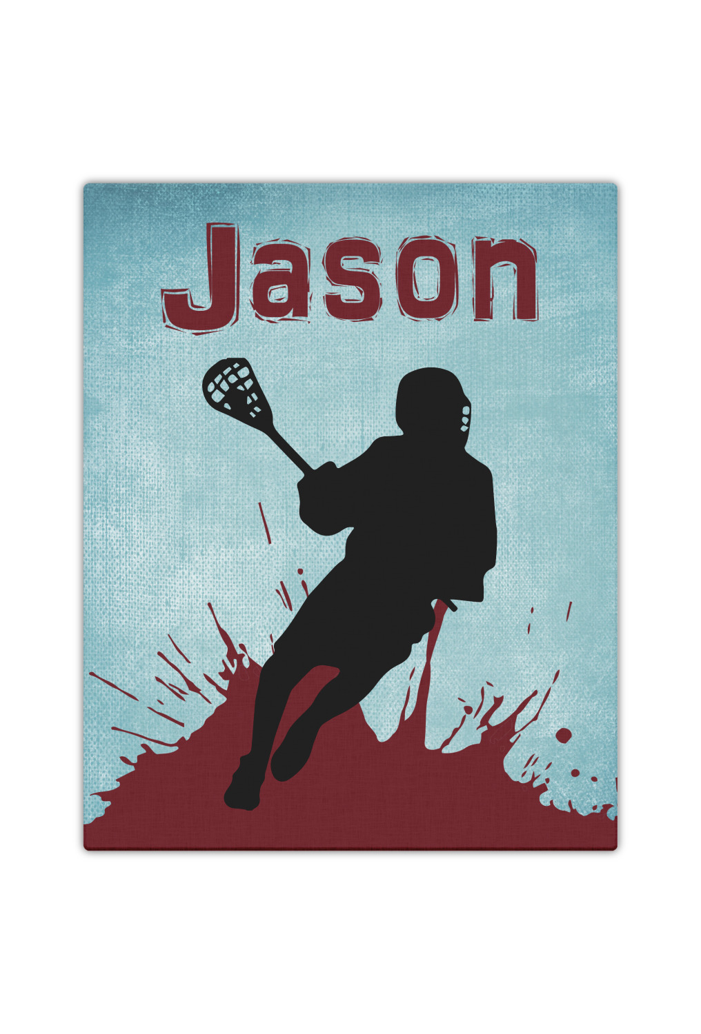 This design has a cool blue background with a literal splash of maroon. Your personalization goes above the lacrosse player silhouette. The movement in this design gives the perfect feeling for a sports design.
