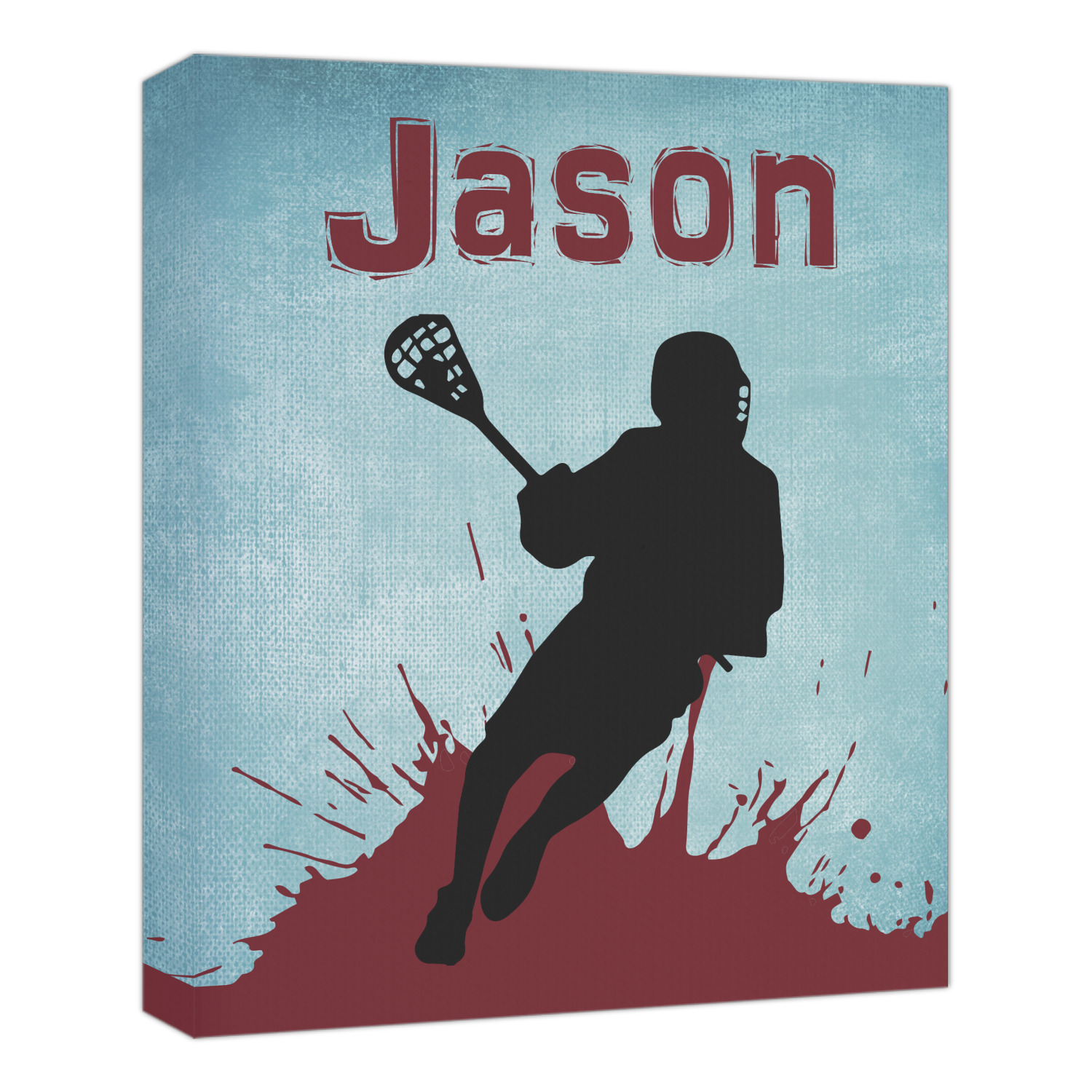 This design has a cool blue background with a literal splash of maroon. Your personalization goes above the lacrosse player silhouette. The movement in this design gives the perfect feeling for a sports design.
