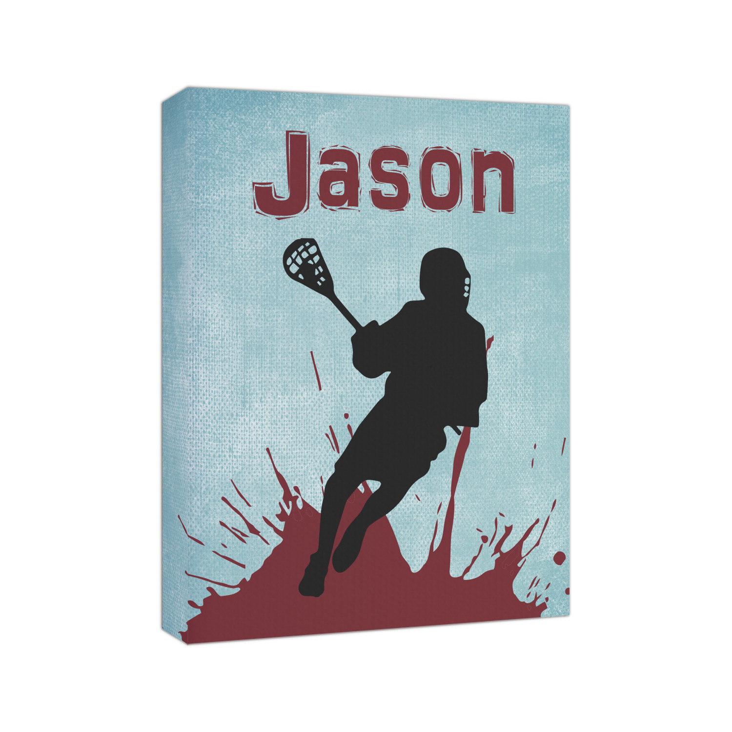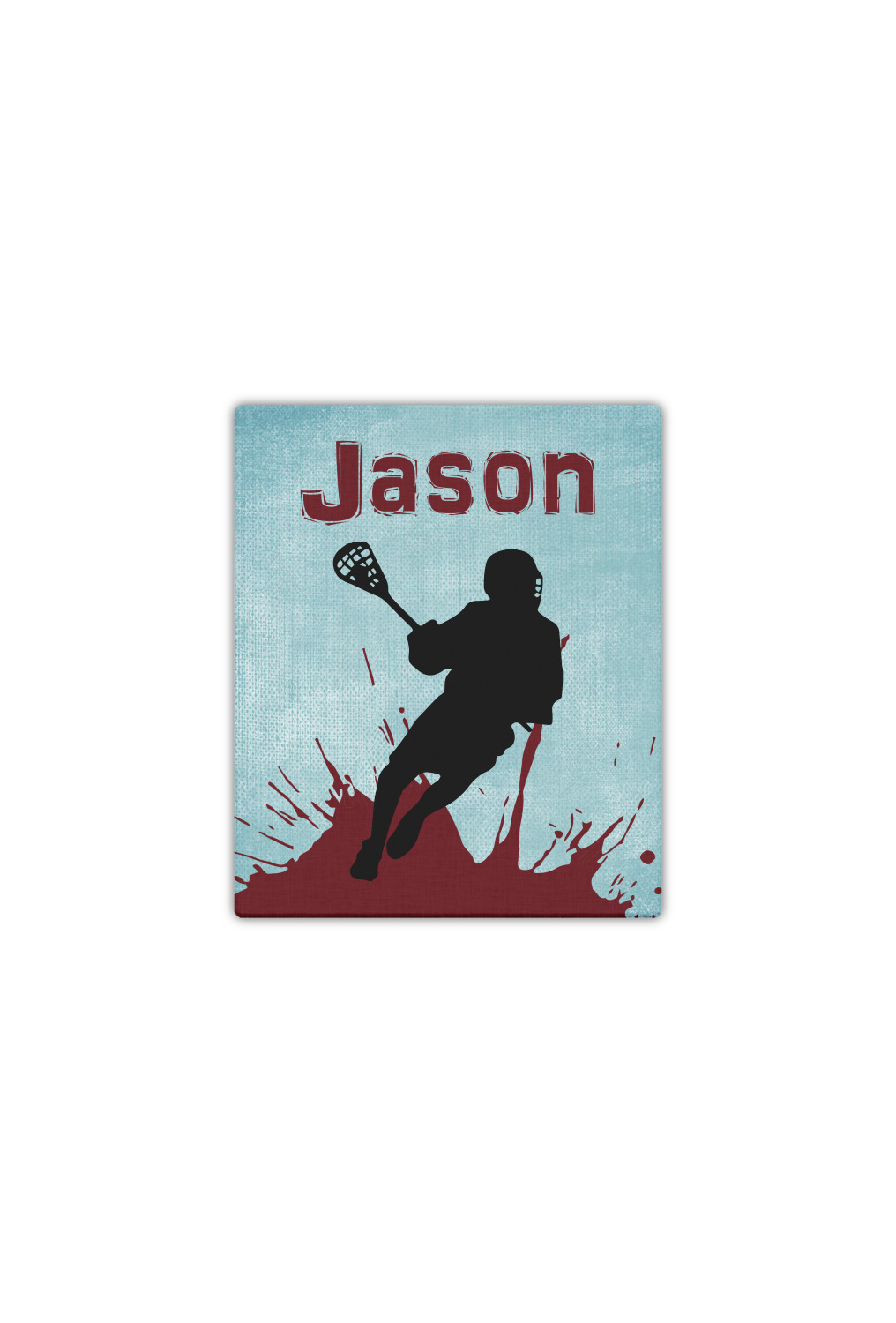 This design has a cool blue background with a literal splash of maroon. Your personalization goes above the lacrosse player silhouette. The movement in this design gives the perfect feeling for a sports design.