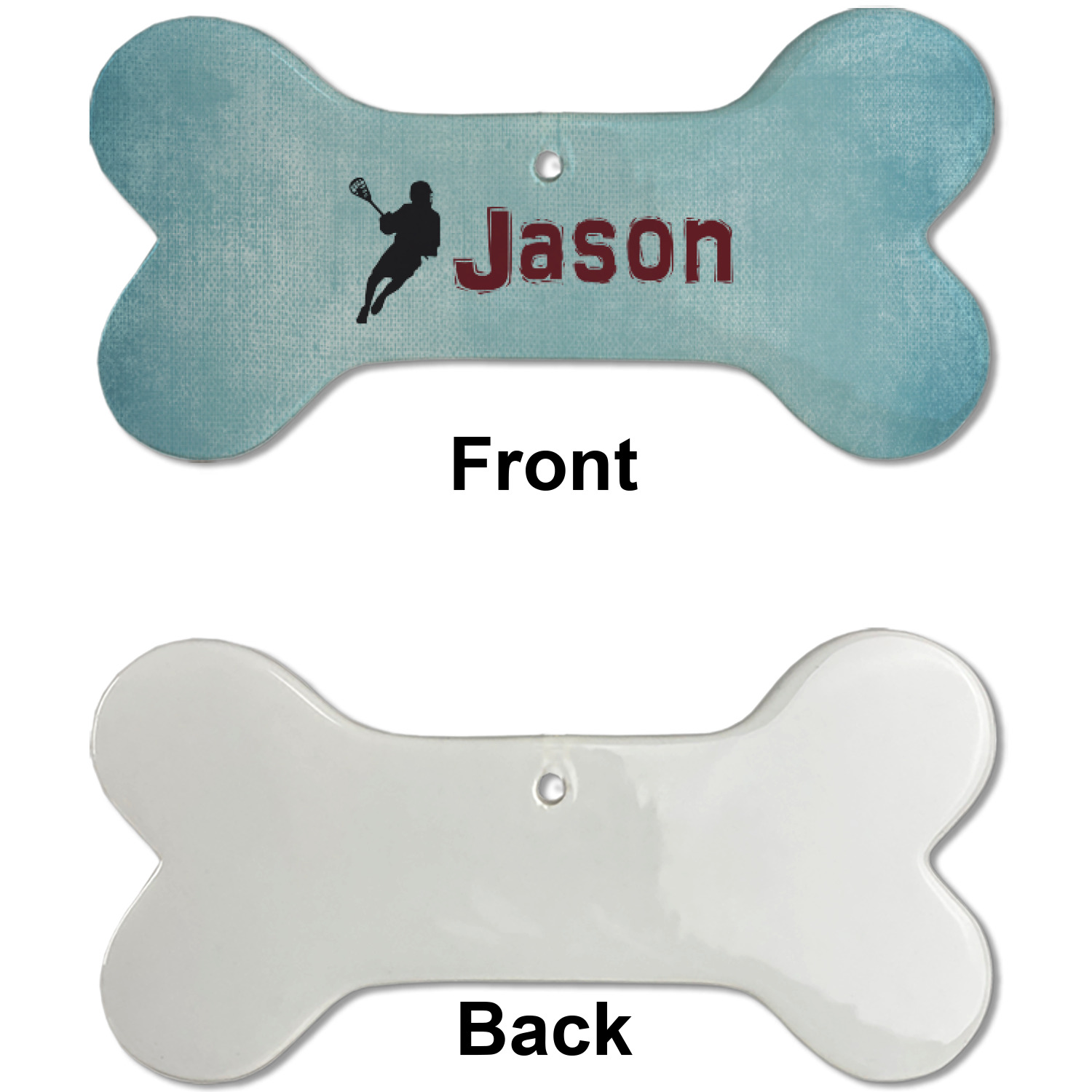Our dog Christmas ornaments are a ceramic material with a bone-shaped structure hung horizontally. We offer two printing styles to personalize your furry friend's ornament! Choose a one-sided printing, perfect for wall decor, memorial accessory, or doghouse nameplate! Create a double-sided ornament perfect for adorning the Christmas tree. Each dog bone ornament is approximately 4.75" x 2.25" and is printed here in the USA.