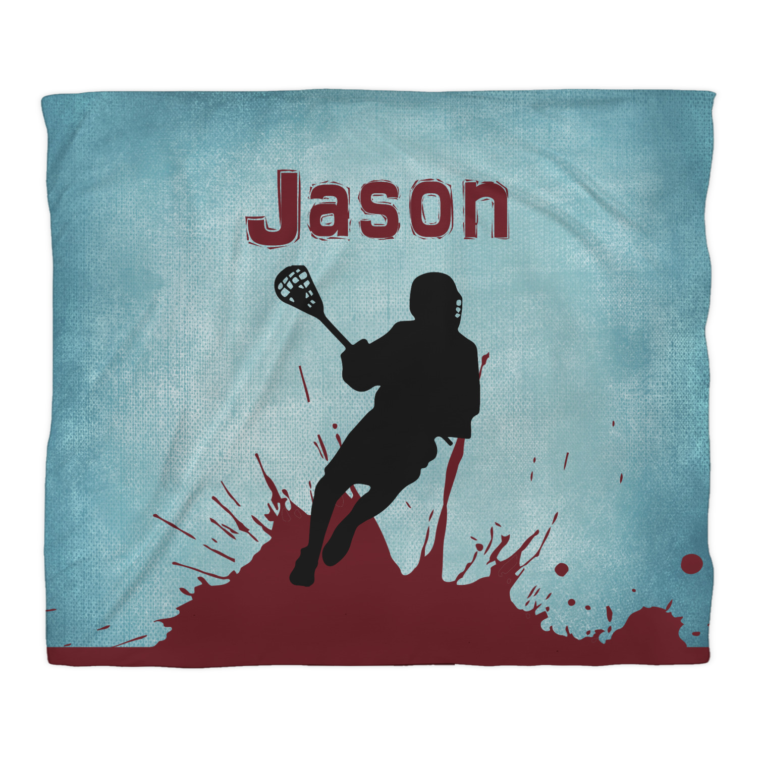 This design has a cool blue background with a literal splash of maroon. Your personalization goes above the lacrosse player silhouette. The movement in this design gives the perfect feeling for a sports design.