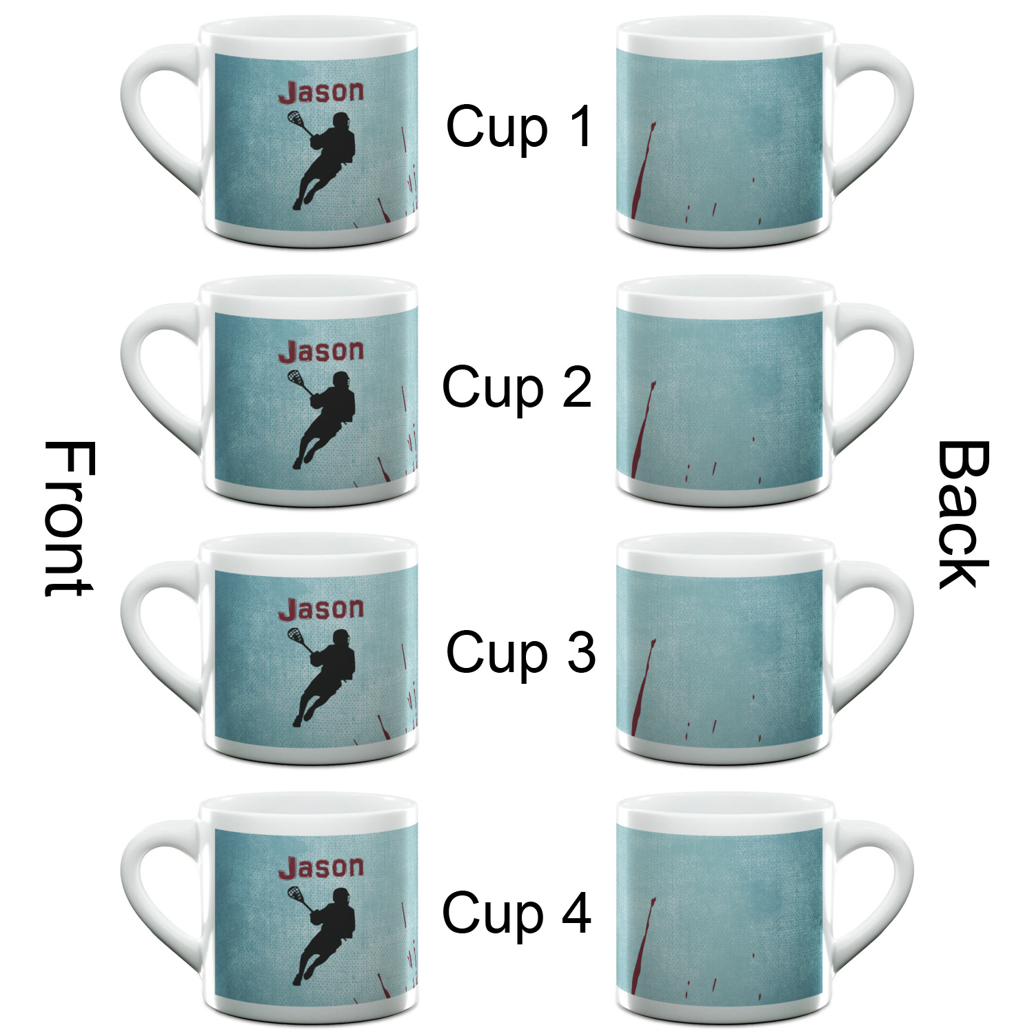 Each of our espresso mugs is a ceramic material sure to keep your drink warm. Personalize one cup for yourself, or order a set of 4! Its the perfect little gift for any coffee lover! We carry two sizes for you to personalize - 3 oz. (approx. 3.25" x 2.325" x 2.625") or 6 oz. (approx. 4" x 2.9" x 2.9"). Our 3 oz. mug is perfect for that single shot espresso while our 6 oz. mug can be your next favorite cappuccino cup holding two shots of espresso!