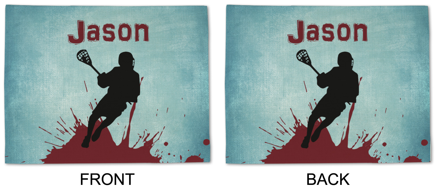 This design has a cool blue background with a literal splash of maroon. Your personalization goes above the lacrosse player silhouette. The movement in this design gives the perfect feeling for a sports design.