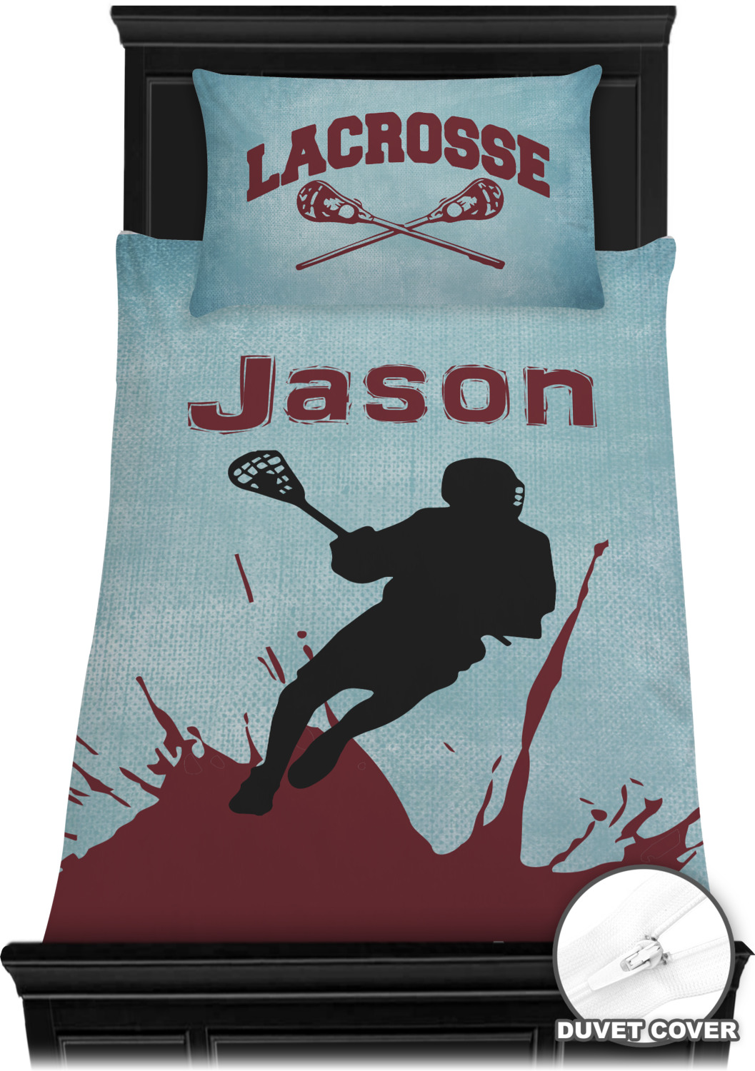 This design has a cool blue background with a literal splash of maroon. Your personalization goes above the lacrosse player silhouette. The movement in this design gives the perfect feeling for a sports design.