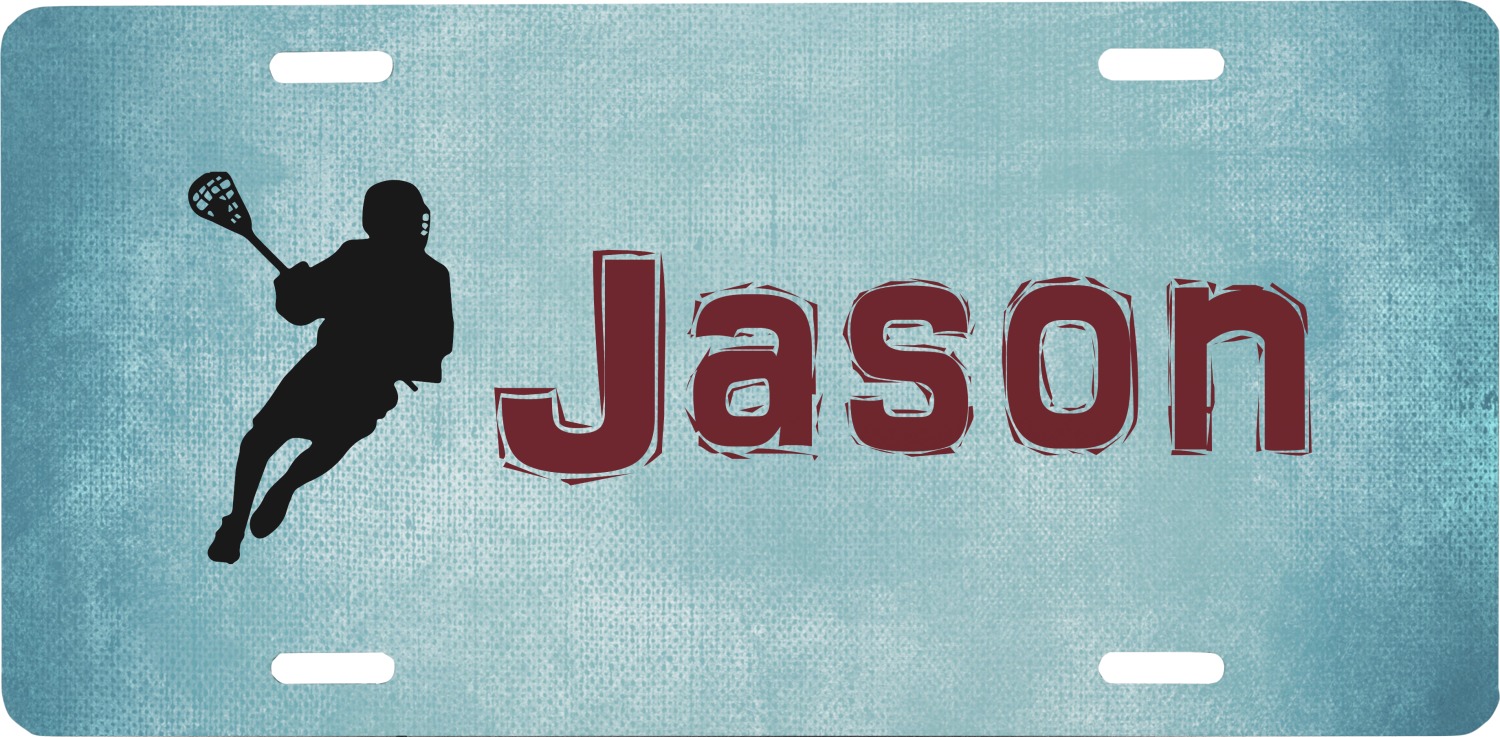 This design has a cool blue background with a literal splash of maroon. Your personalization goes above the lacrosse player silhouette. The movement in this design gives the perfect feeling for a sports design.