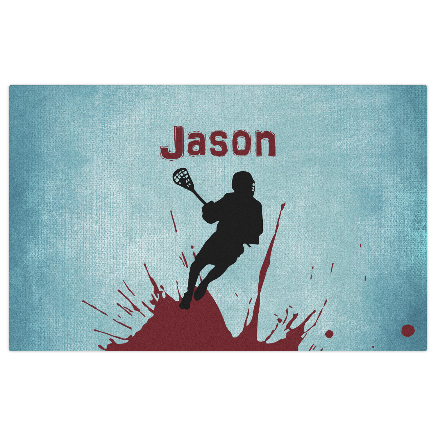 This design has a cool blue background with a literal splash of maroon. Your personalization goes above the lacrosse player silhouette. The movement in this design gives the perfect feeling for a sports design.