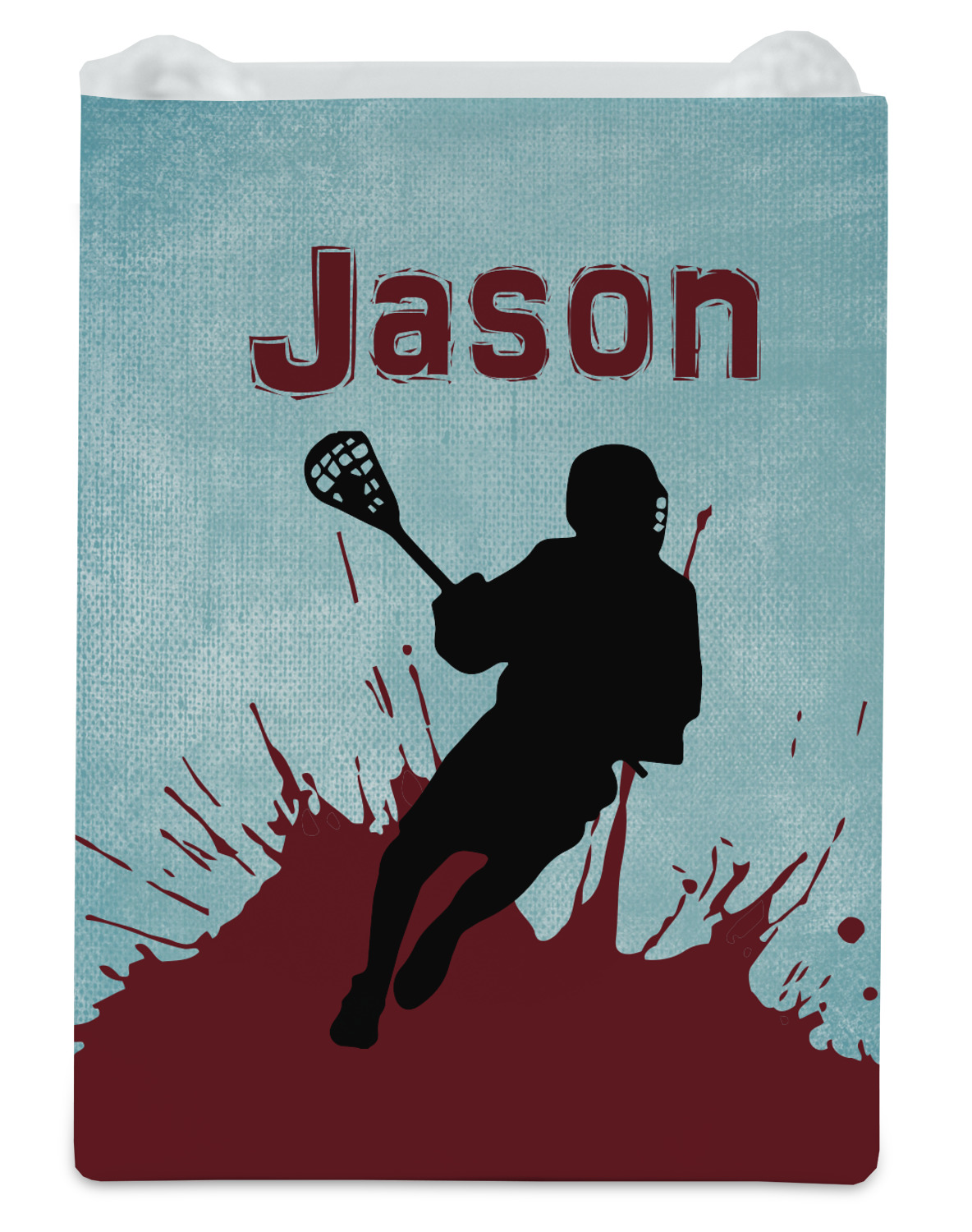 This design has a cool blue background with a literal splash of maroon. Your personalization goes above the lacrosse player silhouette. The movement in this design gives the perfect feeling for a sports design.