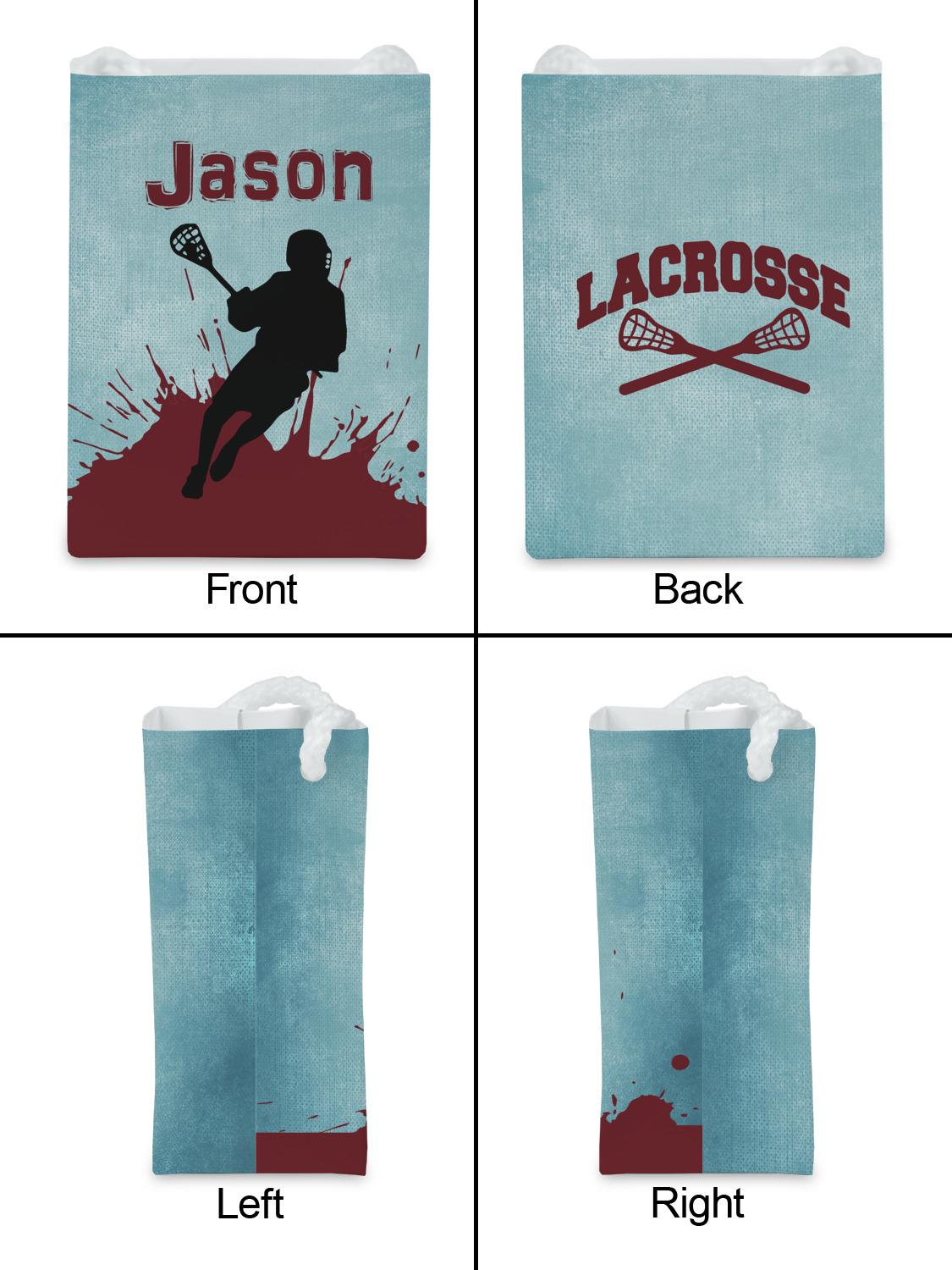 This design has a cool blue background with a literal splash of maroon. Your personalization goes above the lacrosse player silhouette. The movement in this design gives the perfect feeling for a sports design.