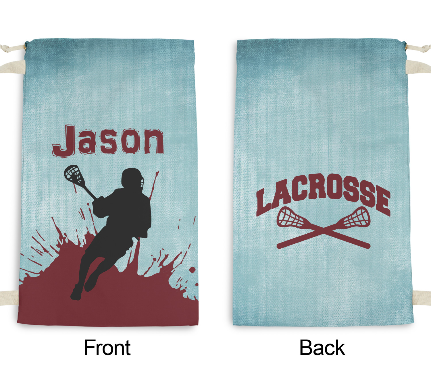 This design has a cool blue background with a literal splash of maroon. Your personalization goes above the lacrosse player silhouette. The movement in this design gives the perfect feeling for a sports design.
