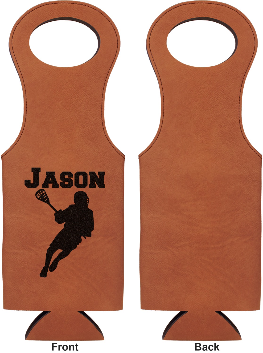 This wine carrier is made from a stunning leatherette, in a cognac-brown color. Strong, black stitching lines the sides of your wine bottle bag and provides extra durability. The interior is lined with a padded, black material to allow for a snug fit once your bottle is placed inside. At the top of this wine gift bag, you'll find two oval shaped handles that elegantly complements the rest of the bag's style. We provide you with the option of laser-engraving the front, or the front and back of your new personalized wine bag!