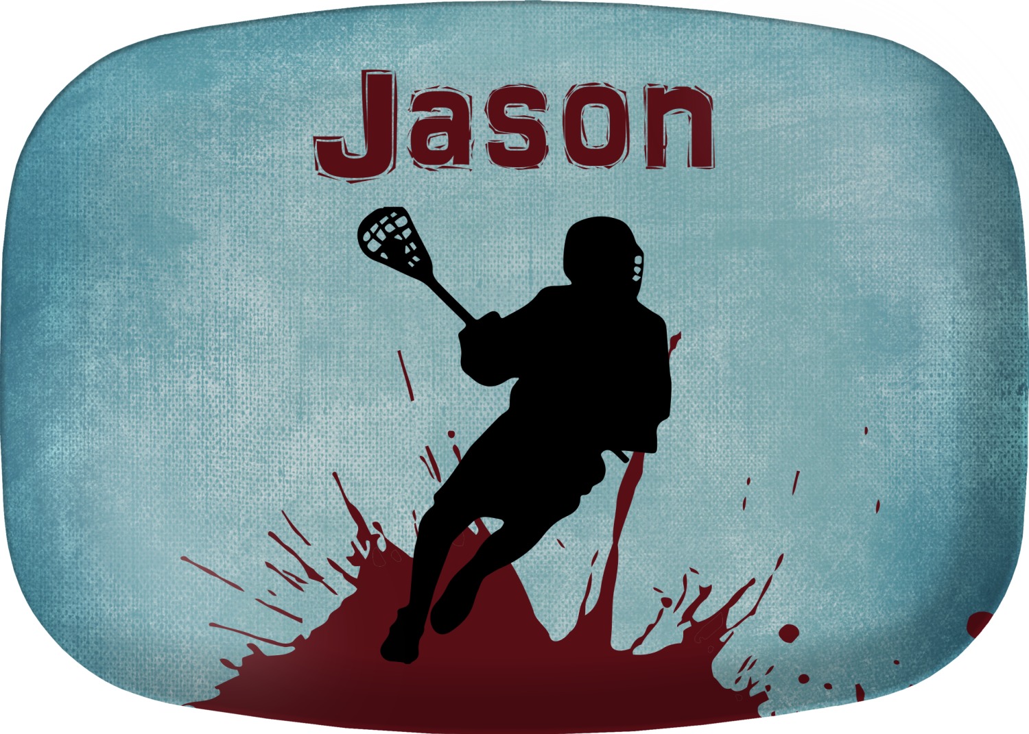 This design has a cool blue background with a literal splash of maroon. Your personalization goes above the lacrosse player silhouette. The movement in this design gives the perfect feeling for a sports design.