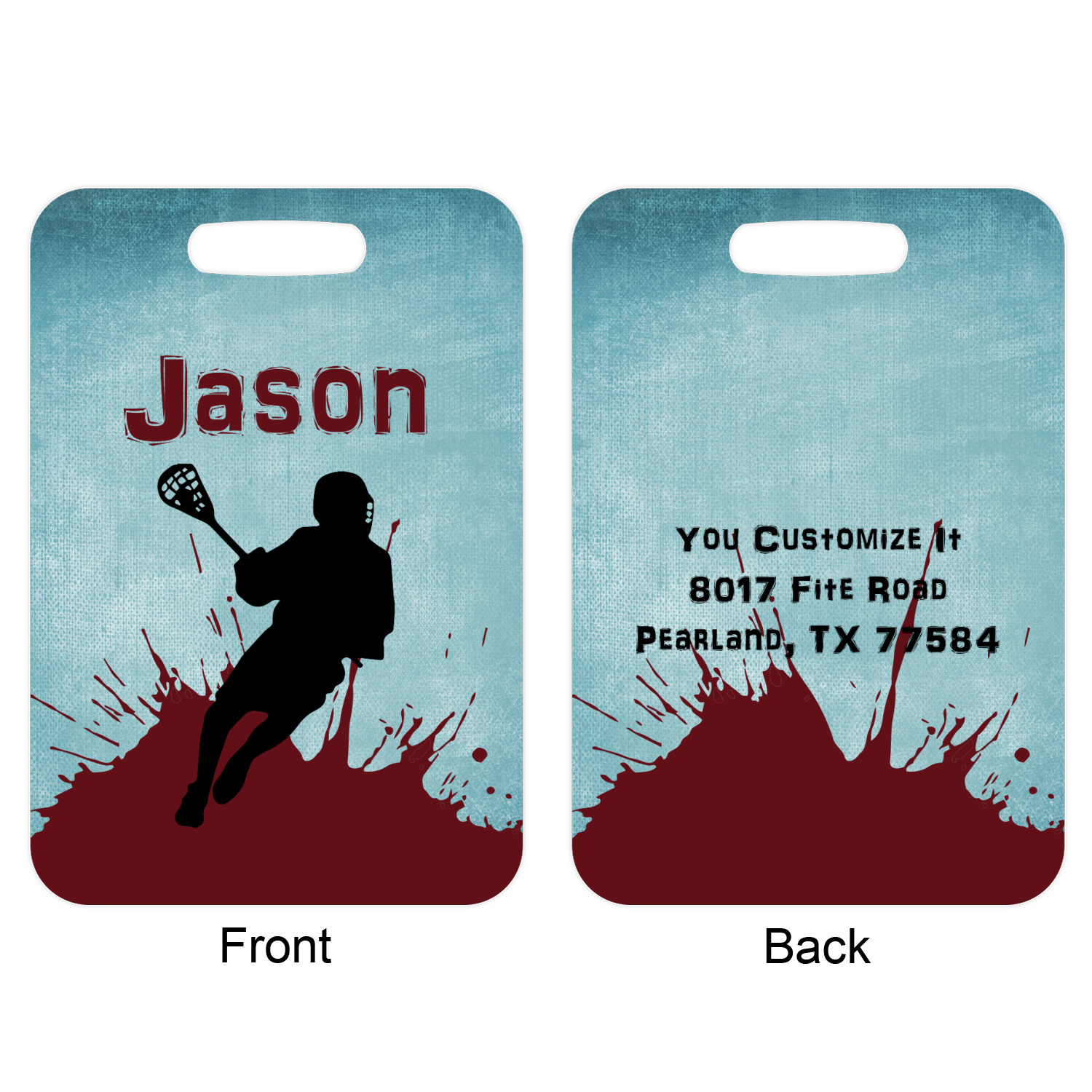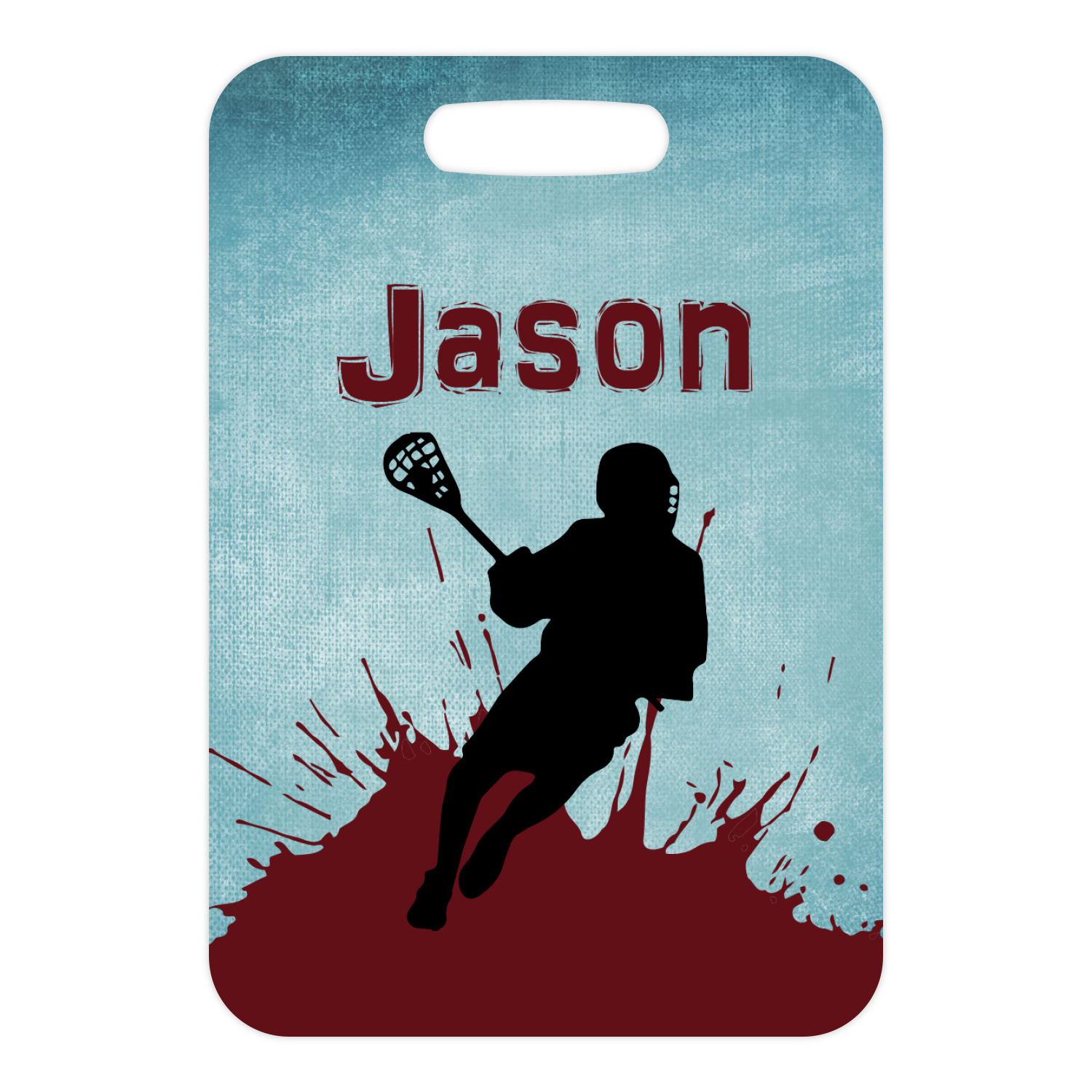 This design has a cool blue background with a literal splash of maroon. Your personalization goes above the lacrosse player silhouette. The movement in this design gives the perfect feeling for a sports design.