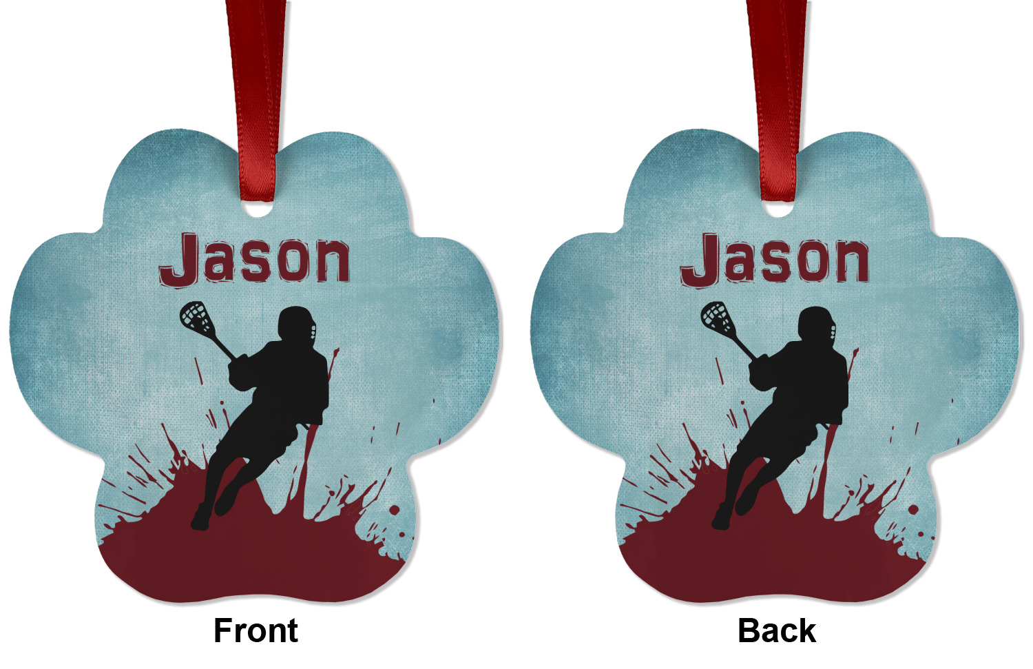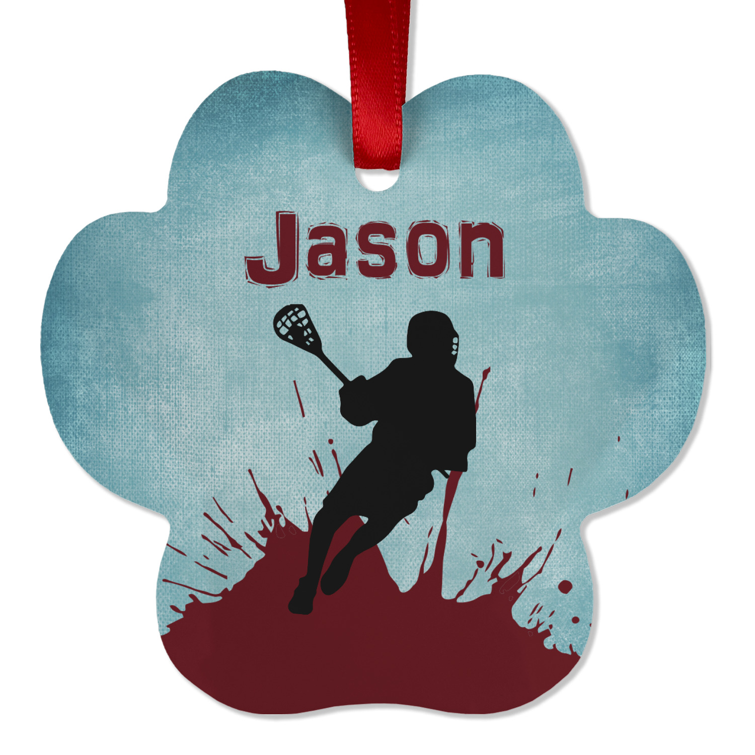 This design has a cool blue background with a literal splash of maroon. Your personalization goes above the lacrosse player silhouette. The movement in this design gives the perfect feeling for a sports design.