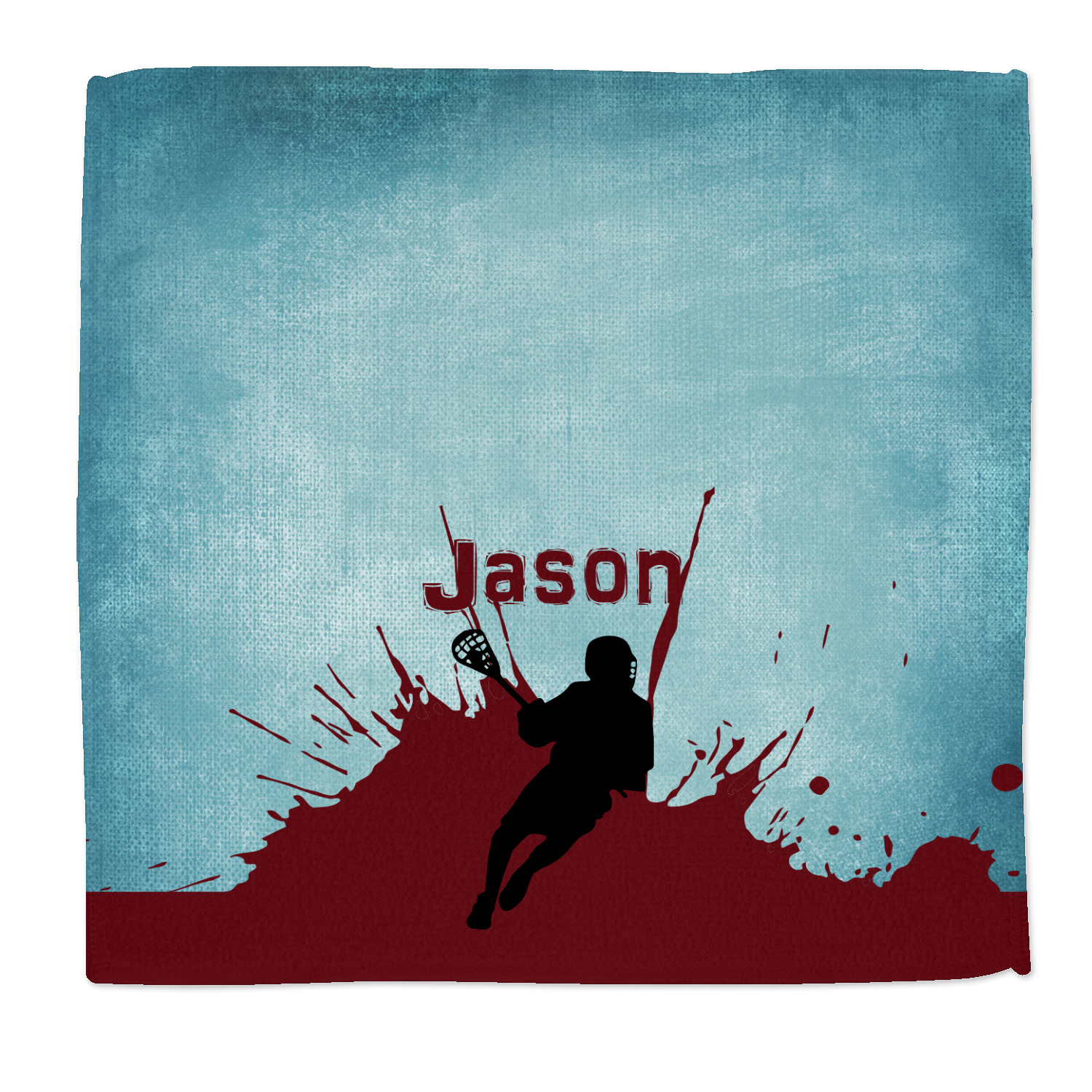 This design has a cool blue background with a literal splash of maroon. Your personalization goes above the lacrosse player silhouette. The movement in this design gives the perfect feeling for a sports design.