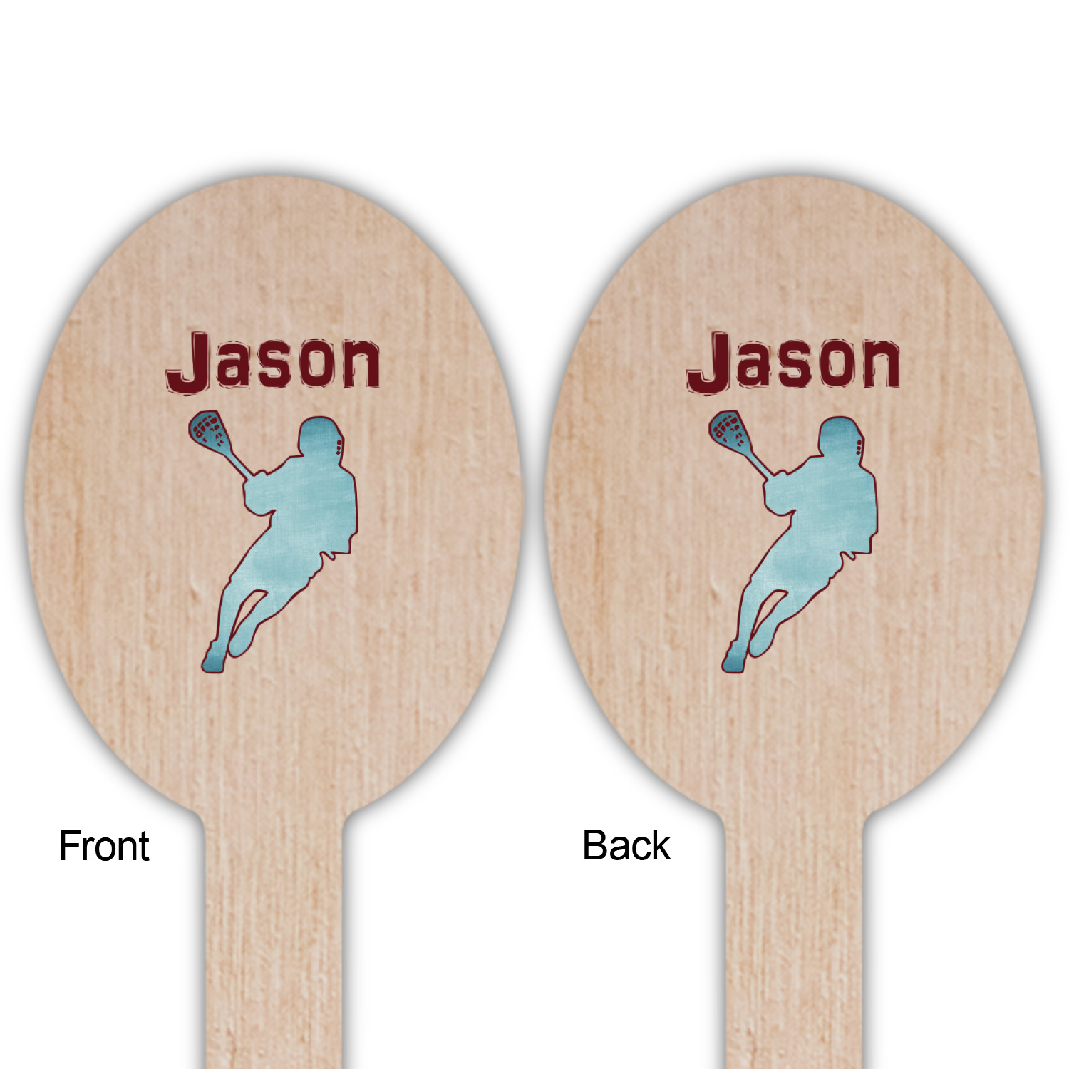 This design has a cool blue background with a literal splash of maroon. Your personalization goes above the lacrosse player silhouette. The movement in this design gives the perfect feeling for a sports design.