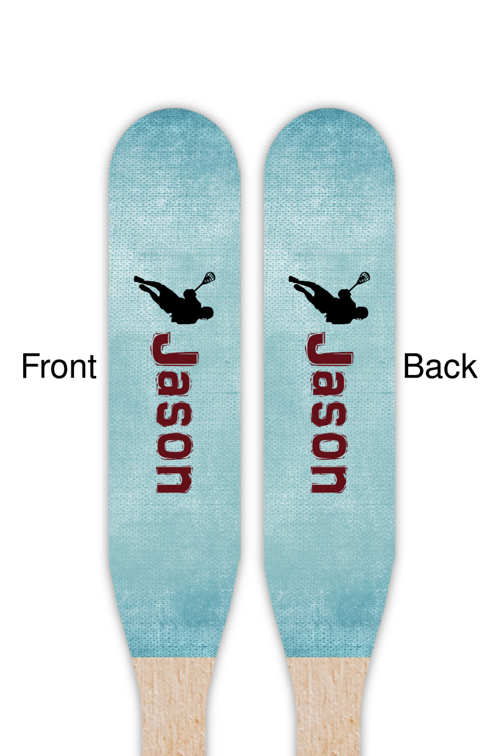 This design has a cool blue background with a literal splash of maroon. Your personalization goes above the lacrosse player silhouette. The movement in this design gives the perfect feeling for a sports design.