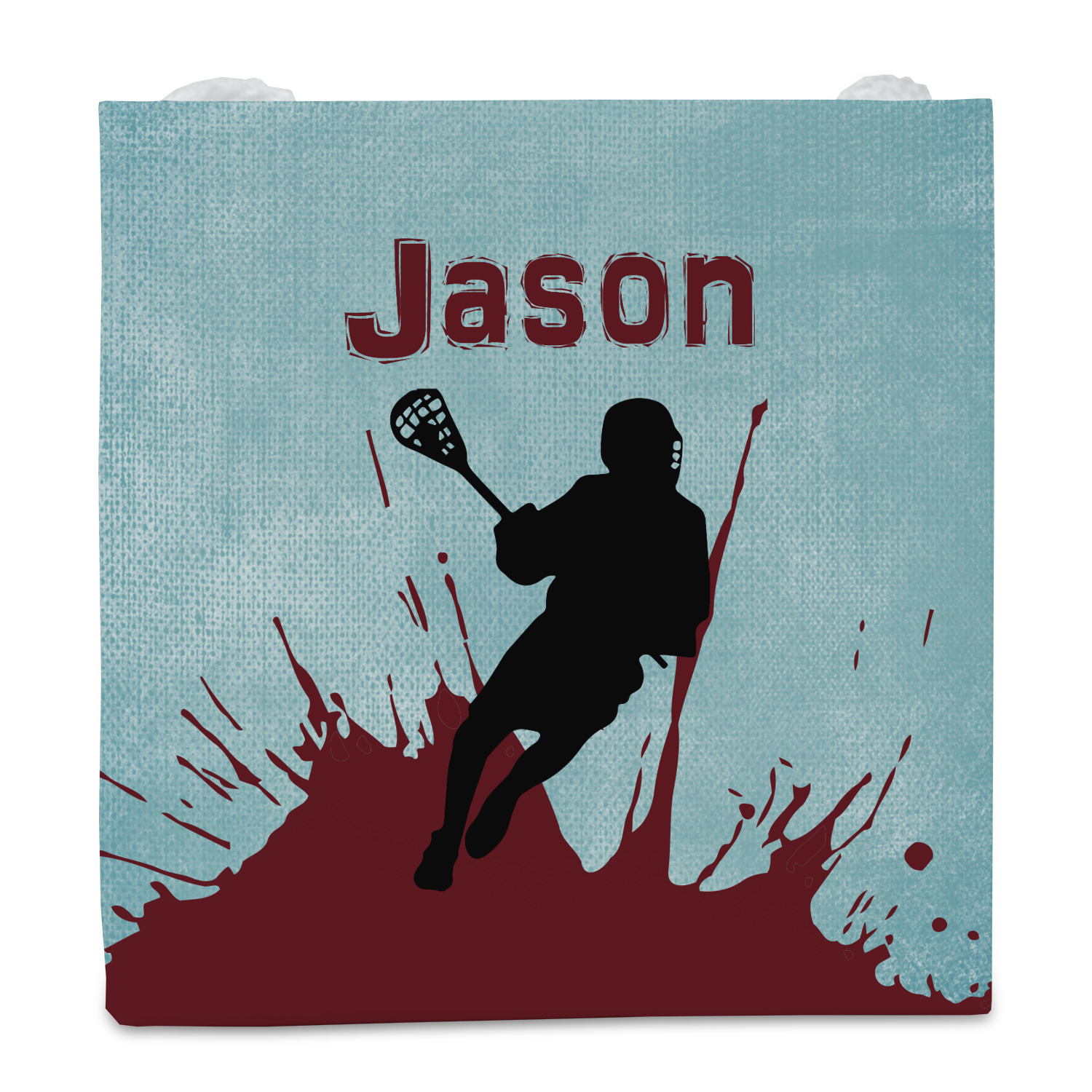 This design has a cool blue background with a literal splash of maroon. Your personalization goes above the lacrosse player silhouette. The movement in this design gives the perfect feeling for a sports design.