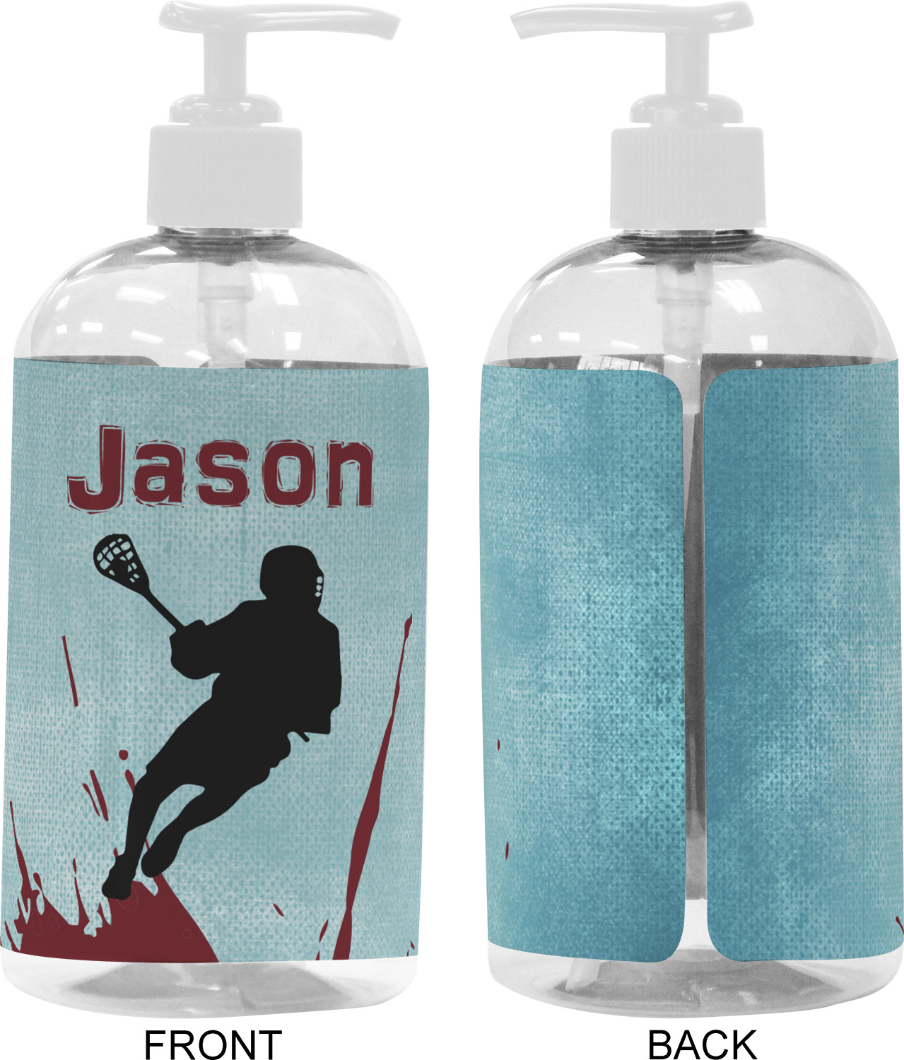 This design has a cool blue background with a literal splash of maroon. Your personalization goes above the lacrosse player silhouette. The movement in this design gives the perfect feeling for a sports design.