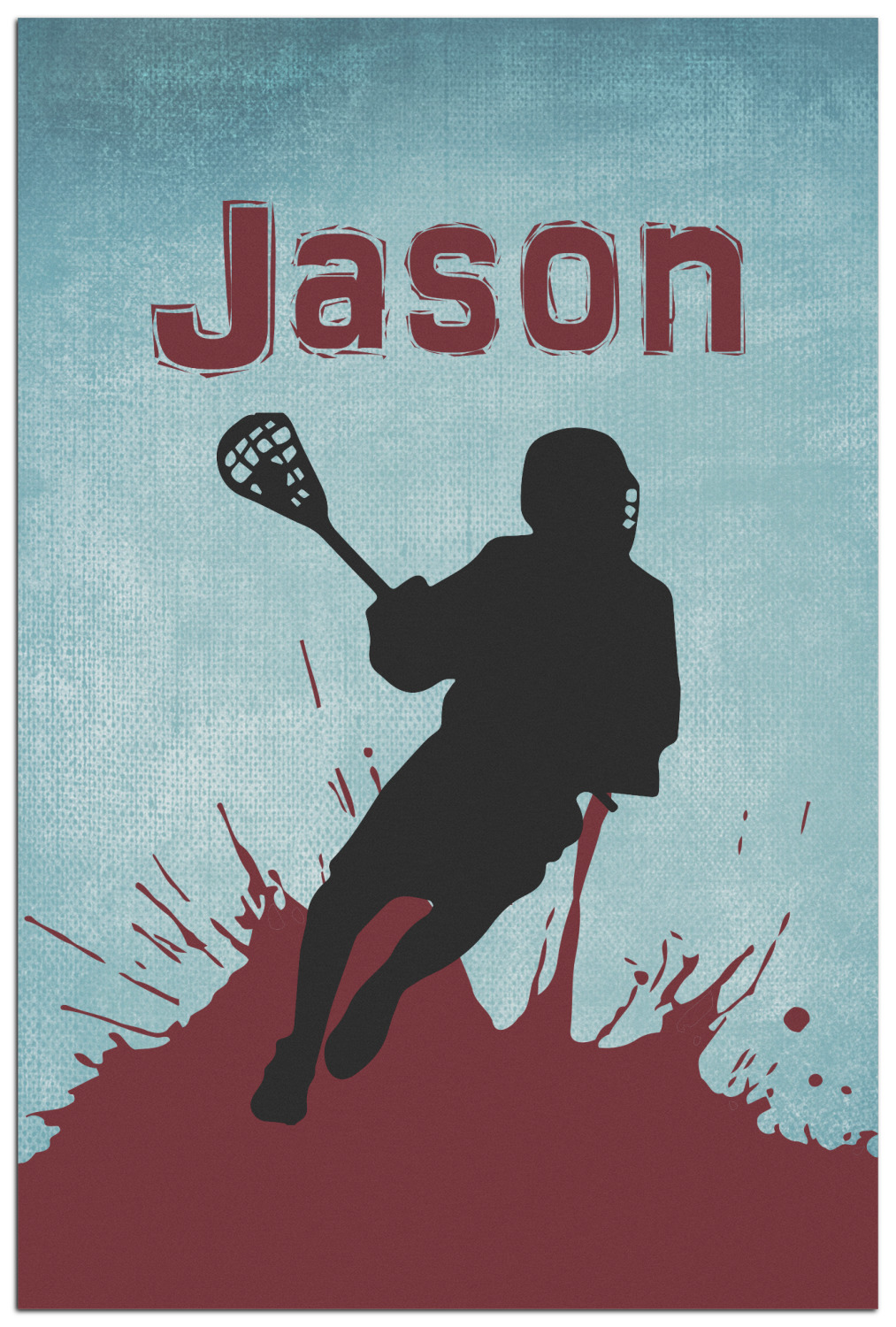 This design has a cool blue background with a literal splash of maroon. Your personalization goes above the lacrosse player silhouette. The movement in this design gives the perfect feeling for a sports design.