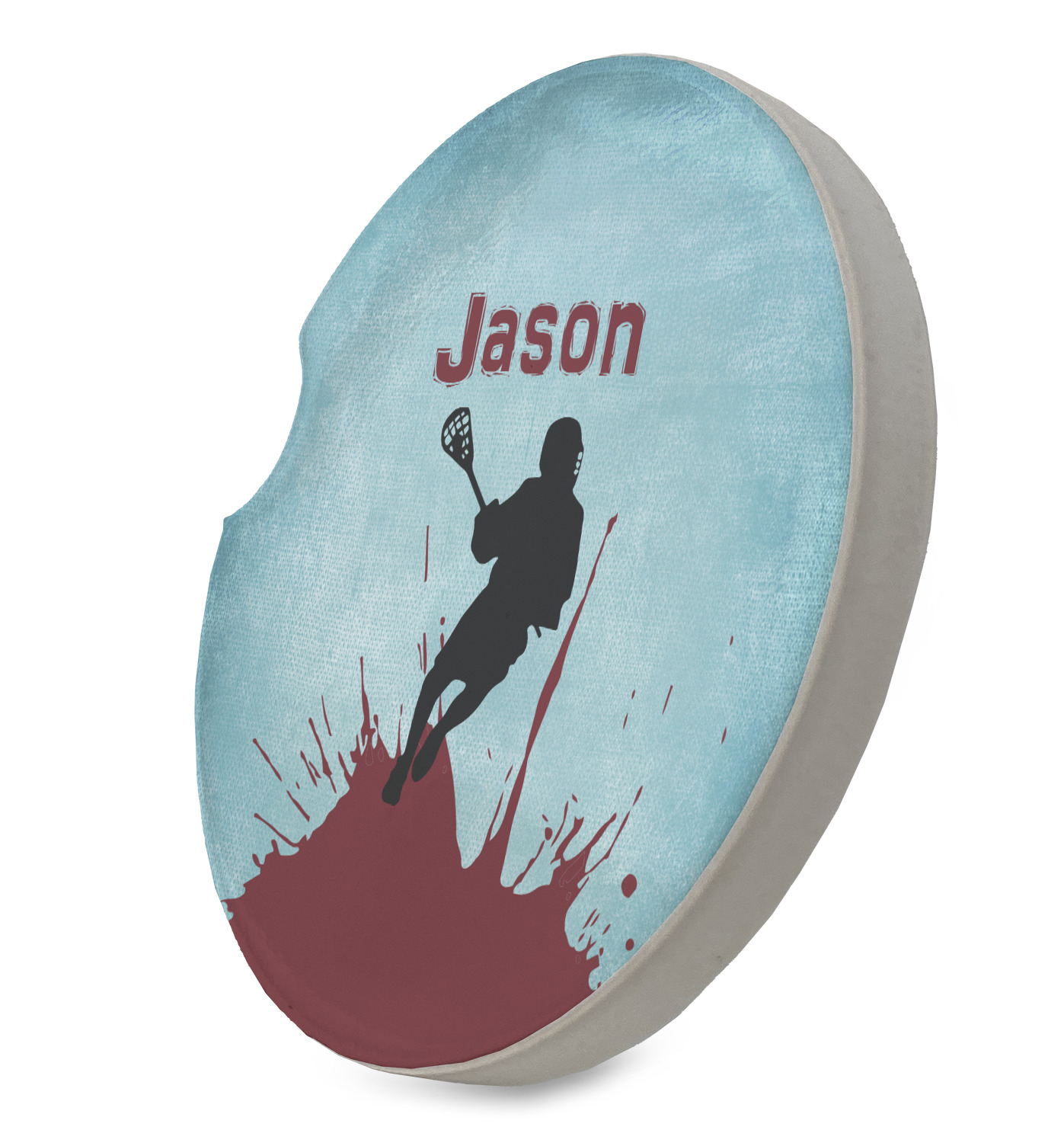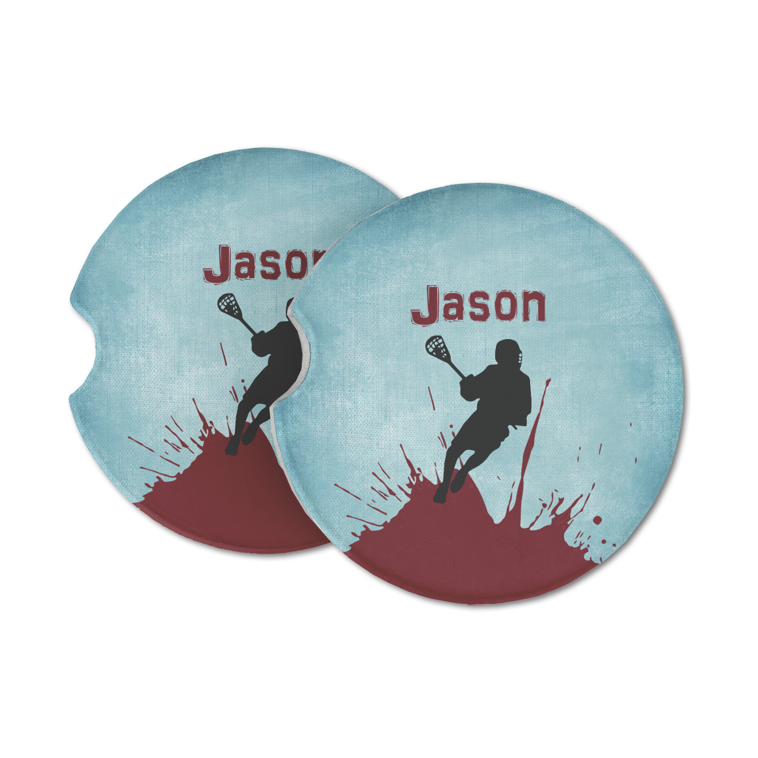 This design has a cool blue background with a literal splash of maroon. Your personalization goes above the lacrosse player silhouette. The movement in this design gives the perfect feeling for a sports design.