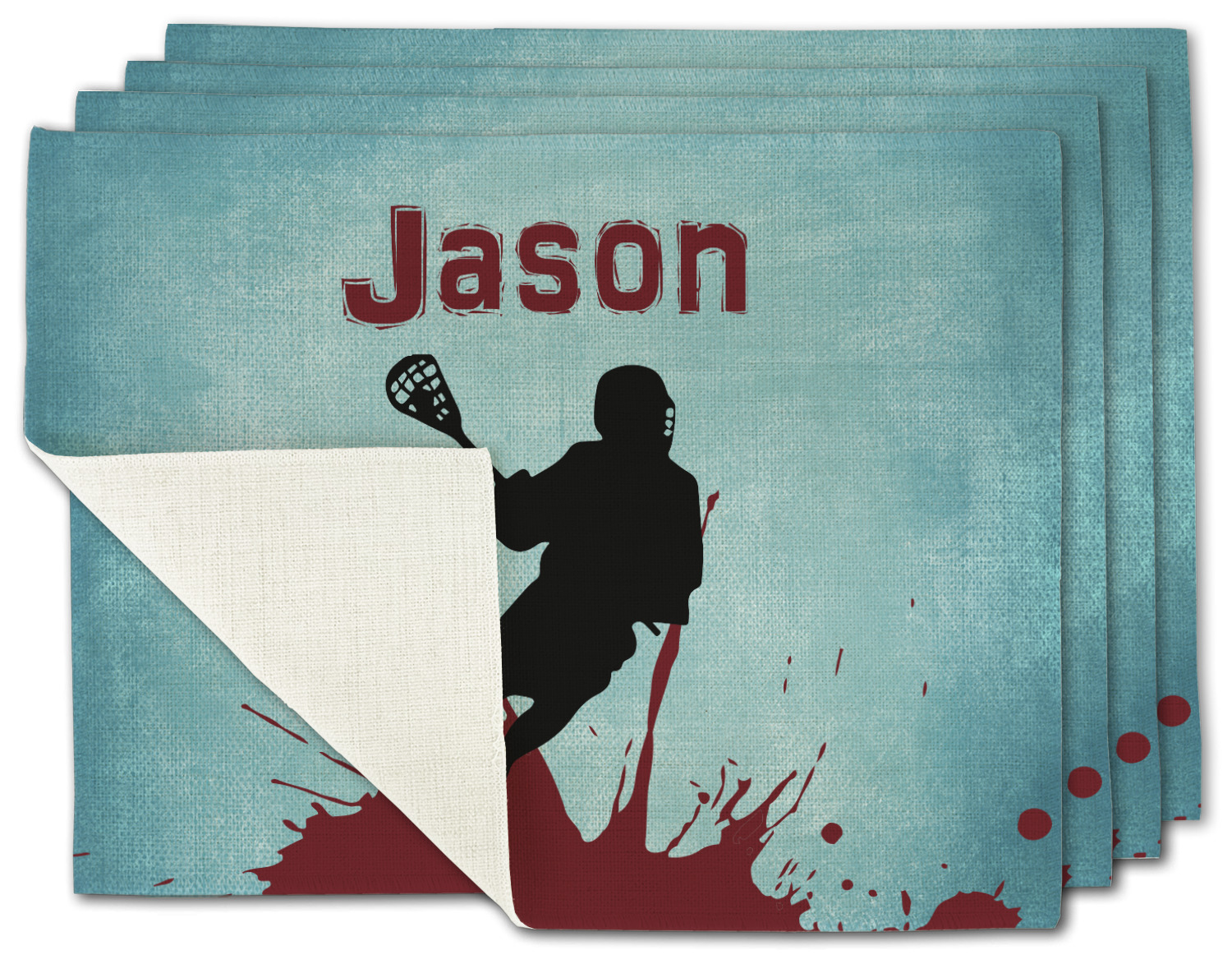 This design has a cool blue background with a literal splash of maroon. Your personalization goes above the lacrosse player silhouette. The movement in this design gives the perfect feeling for a sports design.