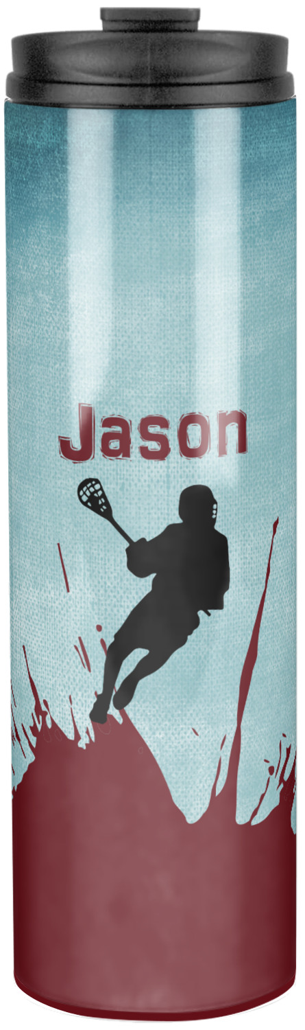 This design has a cool blue background with a literal splash of maroon. Your personalization goes above the lacrosse player silhouette. The movement in this design gives the perfect feeling for a sports design.