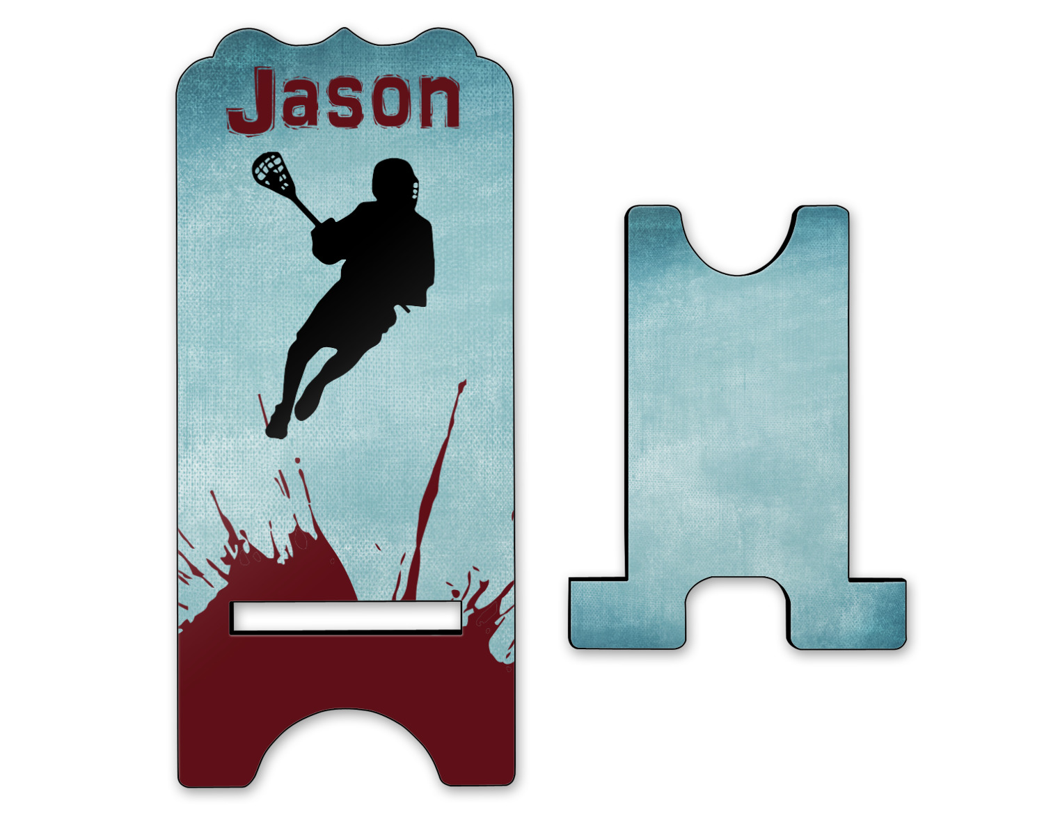 This design has a cool blue background with a literal splash of maroon. Your personalization goes above the lacrosse player silhouette. The movement in this design gives the perfect feeling for a sports design.