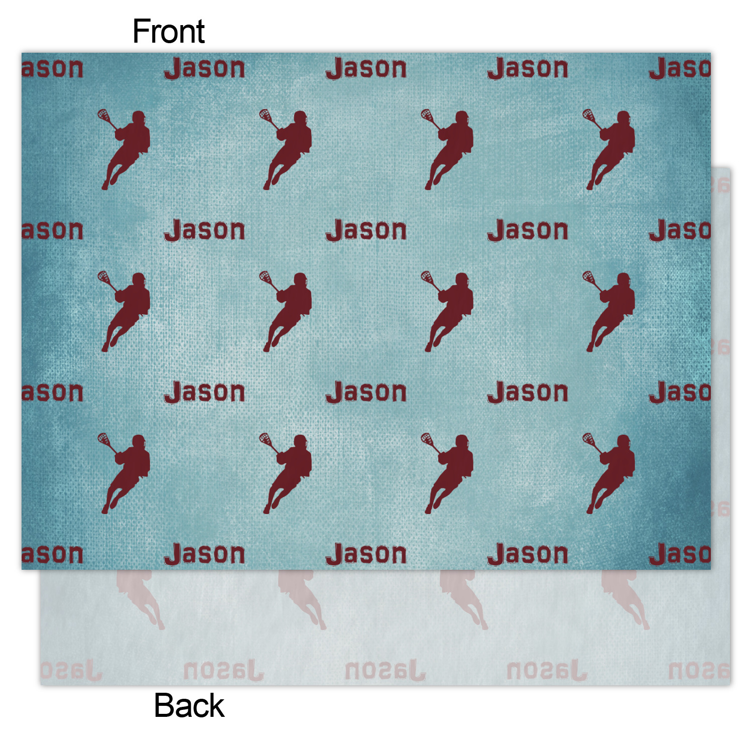 This design has a cool blue background with a literal splash of maroon. Your personalization goes above the lacrosse player silhouette. The movement in this design gives the perfect feeling for a sports design.