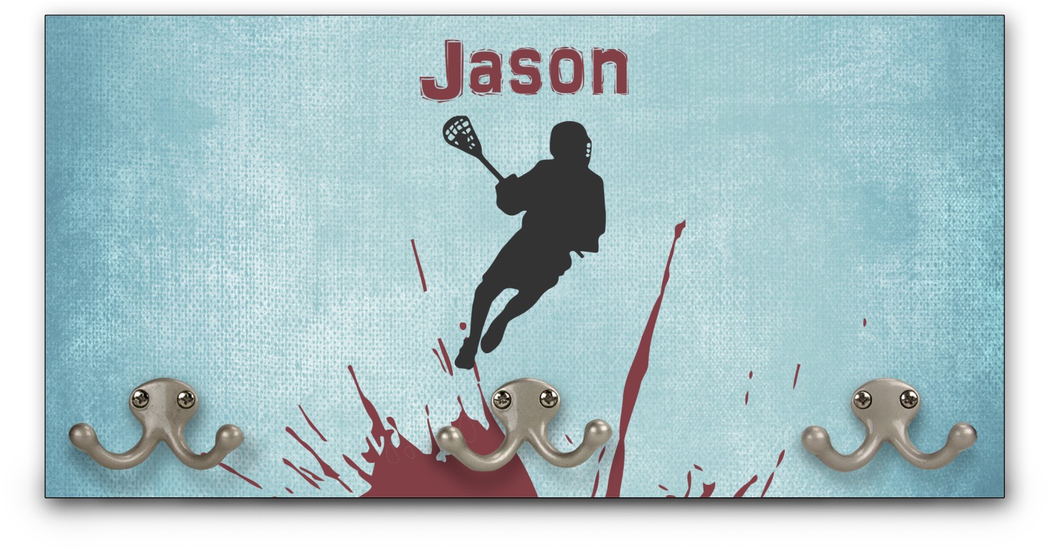This design has a cool blue background with a literal splash of maroon. Your personalization goes above the lacrosse player silhouette. The movement in this design gives the perfect feeling for a sports design.