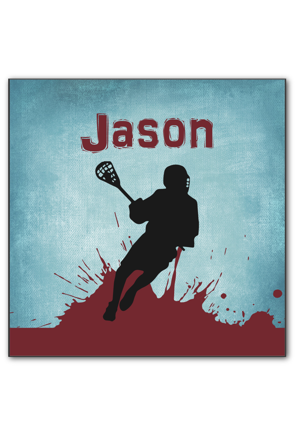 This design has a cool blue background with a literal splash of maroon. Your personalization goes above the lacrosse player silhouette. The movement in this design gives the perfect feeling for a sports design.