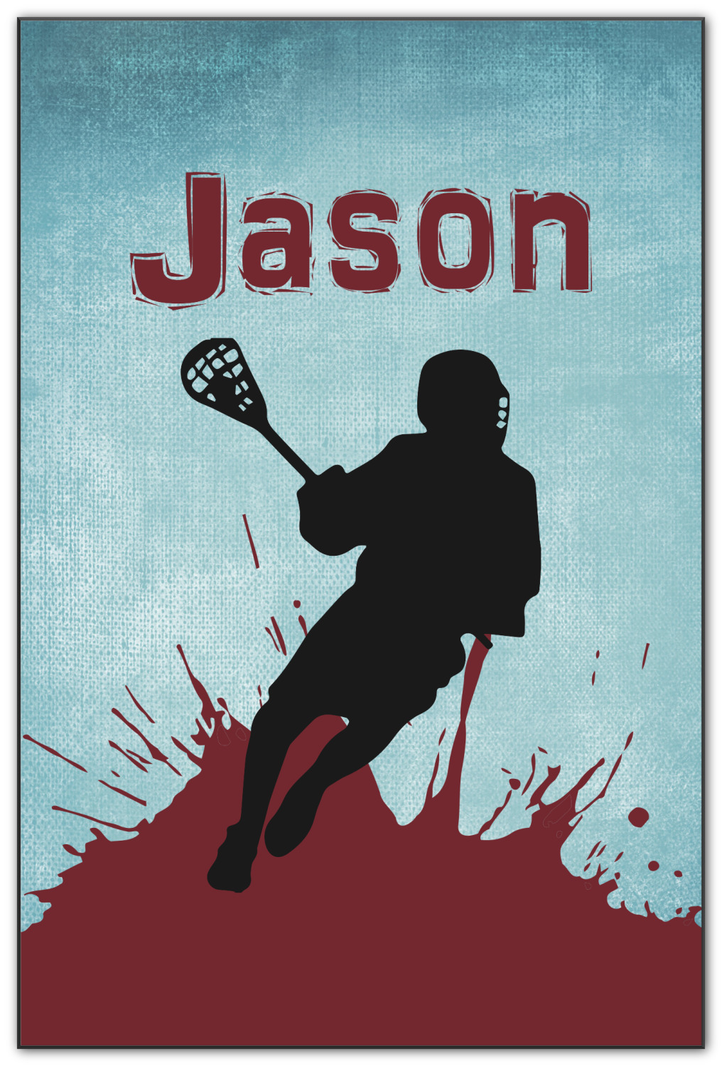 This design has a cool blue background with a literal splash of maroon. Your personalization goes above the lacrosse player silhouette. The movement in this design gives the perfect feeling for a sports design.