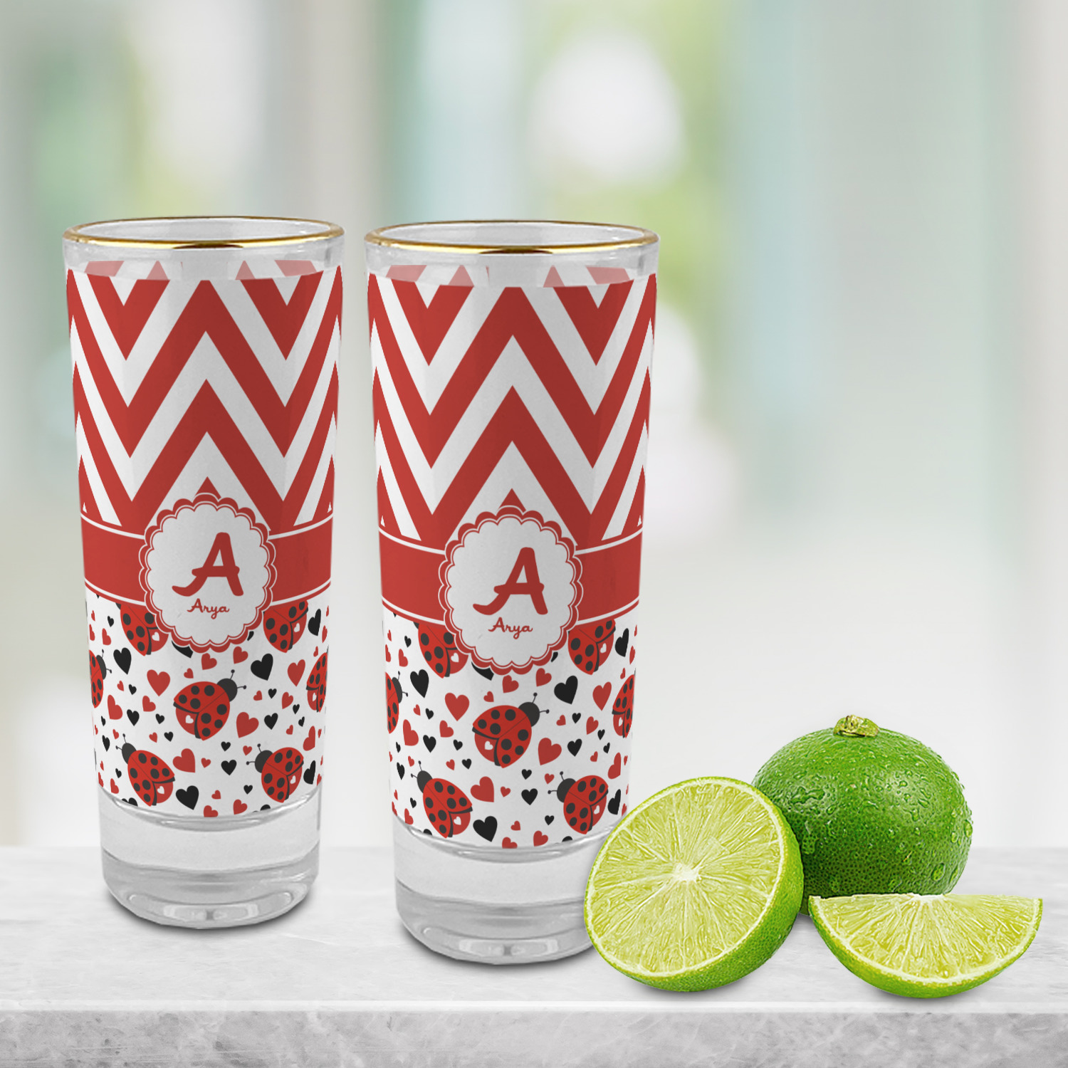 These glass shooter glasses are printed in full color with the design of your choice. These are a tall shooter 2 oz size and stand 4" tall. The print is a full wrap design to boldly display your personalization.