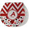 A wide band of red with an inset of white trim pulls the design together. A white scalloped circle label that is trimmed in double rows of red will provide the focal point for personalization of your choice.