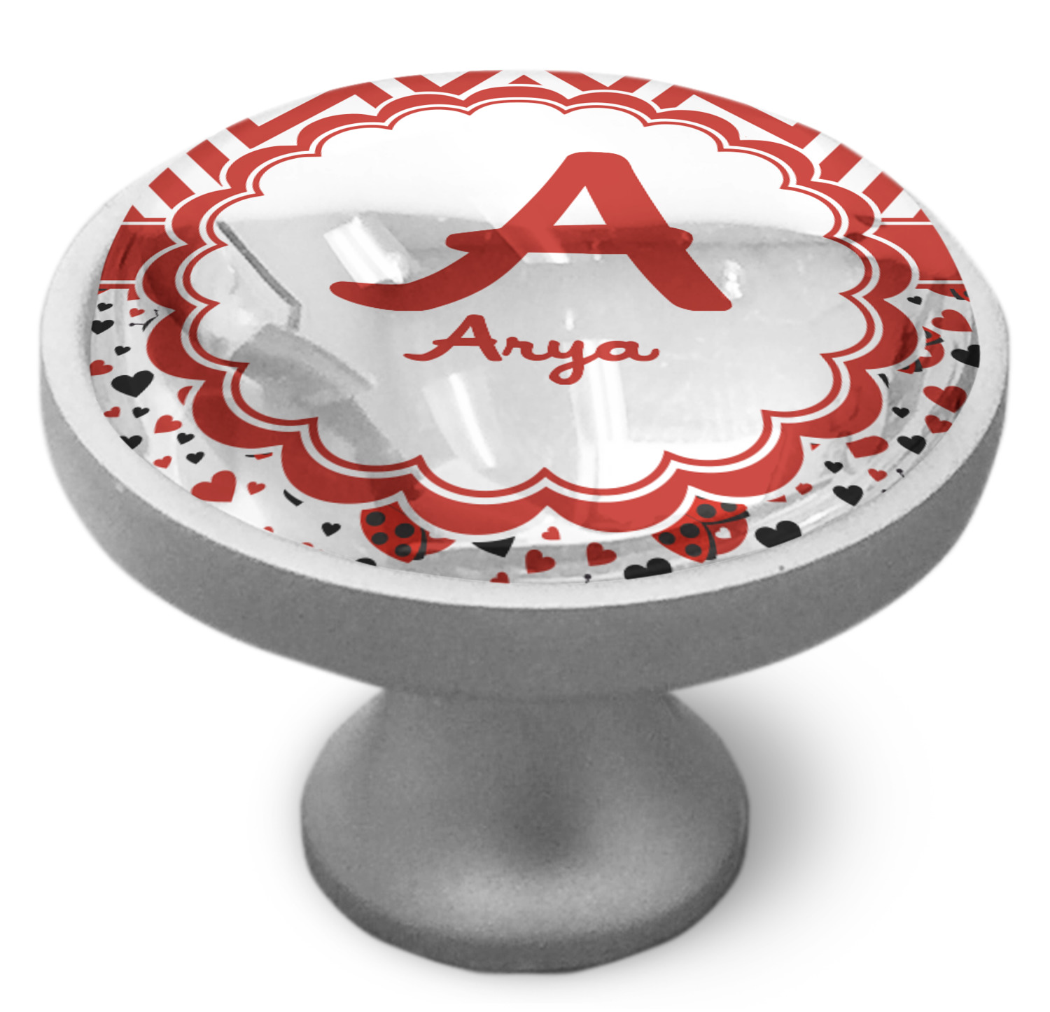 We sell these cabinet pulls in two different colors to better match your room's color scheme. We offer an oil-rubbed bronze base that is black in color, and a satin nickel option, which has a silver color. Your design is displayed across a high gloss vinyl insert that is placed on top of these cabinet handles. We then place a 1 inch thick glass cabochon atop the design, which seals the cabinet knob and makes the colors of your customization stand out. These custom cabinet knobs are approximately 1.3 inches in diameter. Your purchase includes a 1 inch screw that can be used to mount the knob to any cabinet in your home.