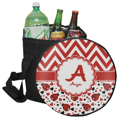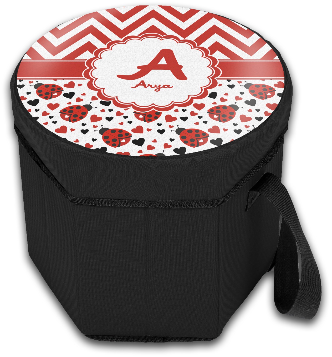 Our collapsible insulated coolers feature a unique six-sided hexagon shape, are lightweight, durable and can be turned into a seat. This cooler is fully insulated with silver foil lining to keep food and drinks hot or cold, and has a 12-quart capacity. Although this cooler collapses for easy transport, hidden inside are composition panels made of sturdy wood that give the frame strength and allow this cooler to be used as a seat. Simply sit down on the personalized cover and give your legs a break! (Maximum weight capacity of 200 pounds.)