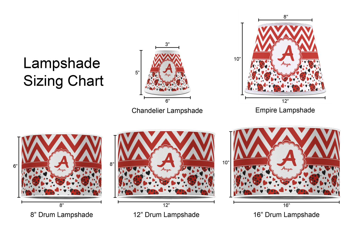 Our customized lamp shades also come in 3 different sizes: 8", 12" and 16", measuring at 8" in diameter by 6" tall, 12" in diameter by 8" tall, and 16" in diameter by 10" tall, respectively.